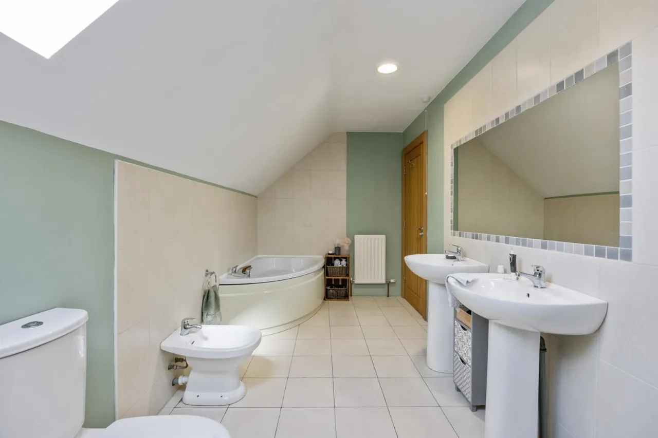 Ensuite - Modern ensuite shower room comprising a white suite with panelled bath and mixer taps, walk-in shower enclosure, low flush WC, twin wash hand basins, and bidet.