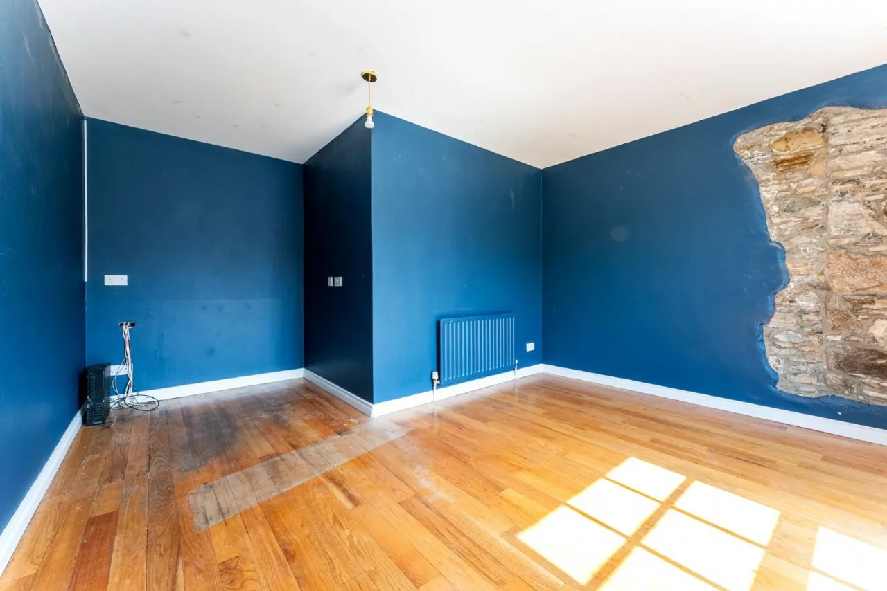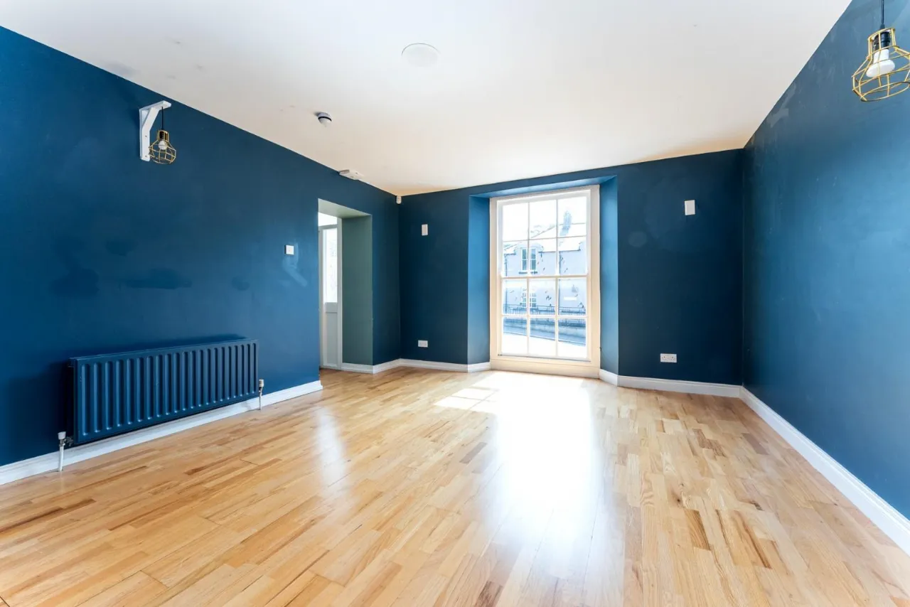 Wood floor, Radiator, Victorian style window, Decorative brick work on walls.