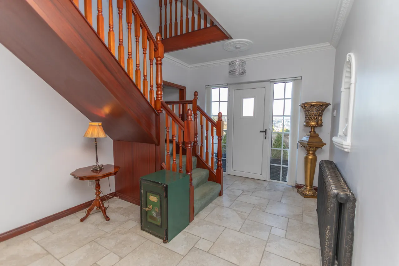 Tiled floor, cast iron radiator, L shaped carpet staircase leading to first floor.
