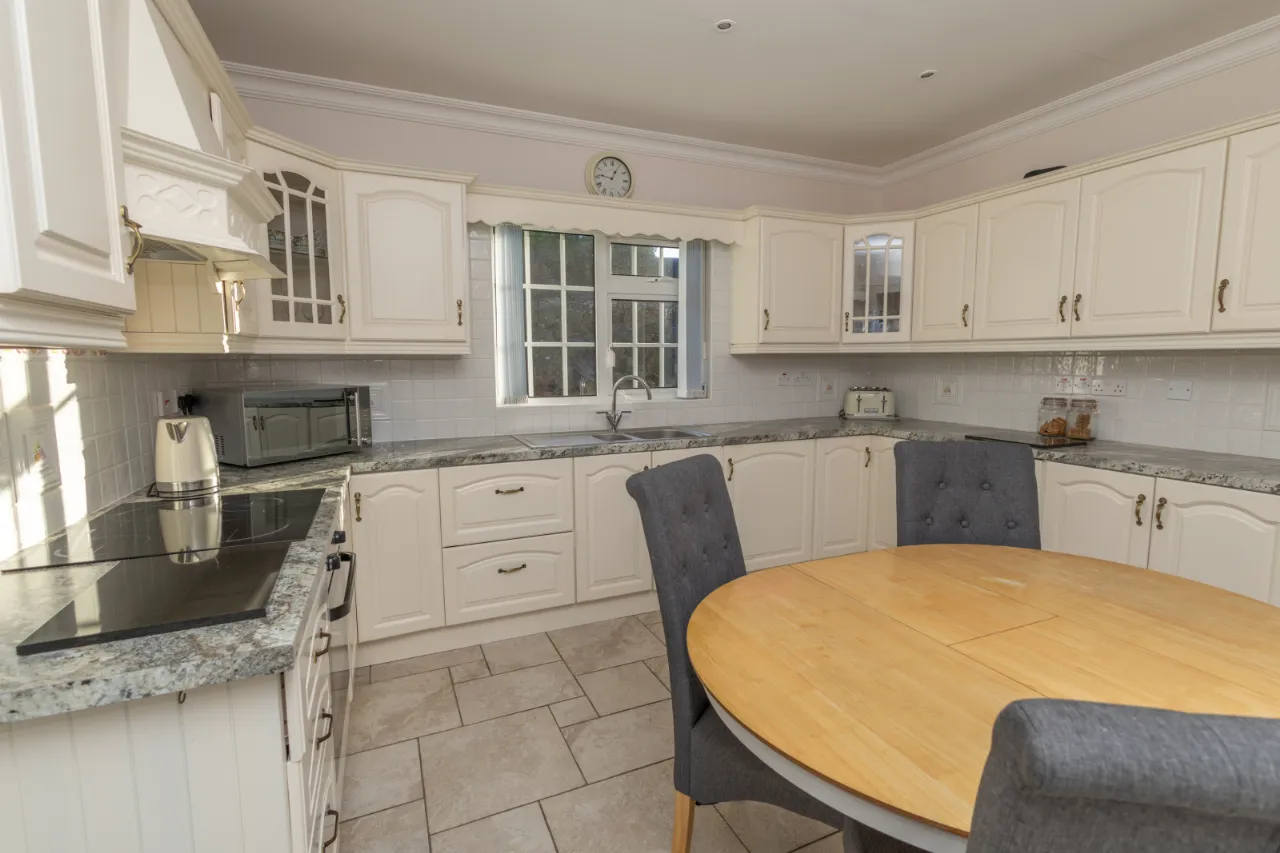 Tiled floor, high and low level storage units, tiled splachback surround, double doors leading to sun room, electric hob and cooker, double basin sink.