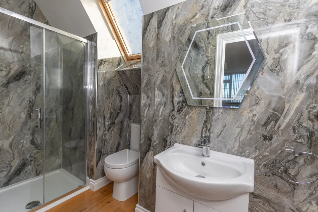 PVC marble effect surround, LED illuminated mirror, toilet, sink, skylight window.
