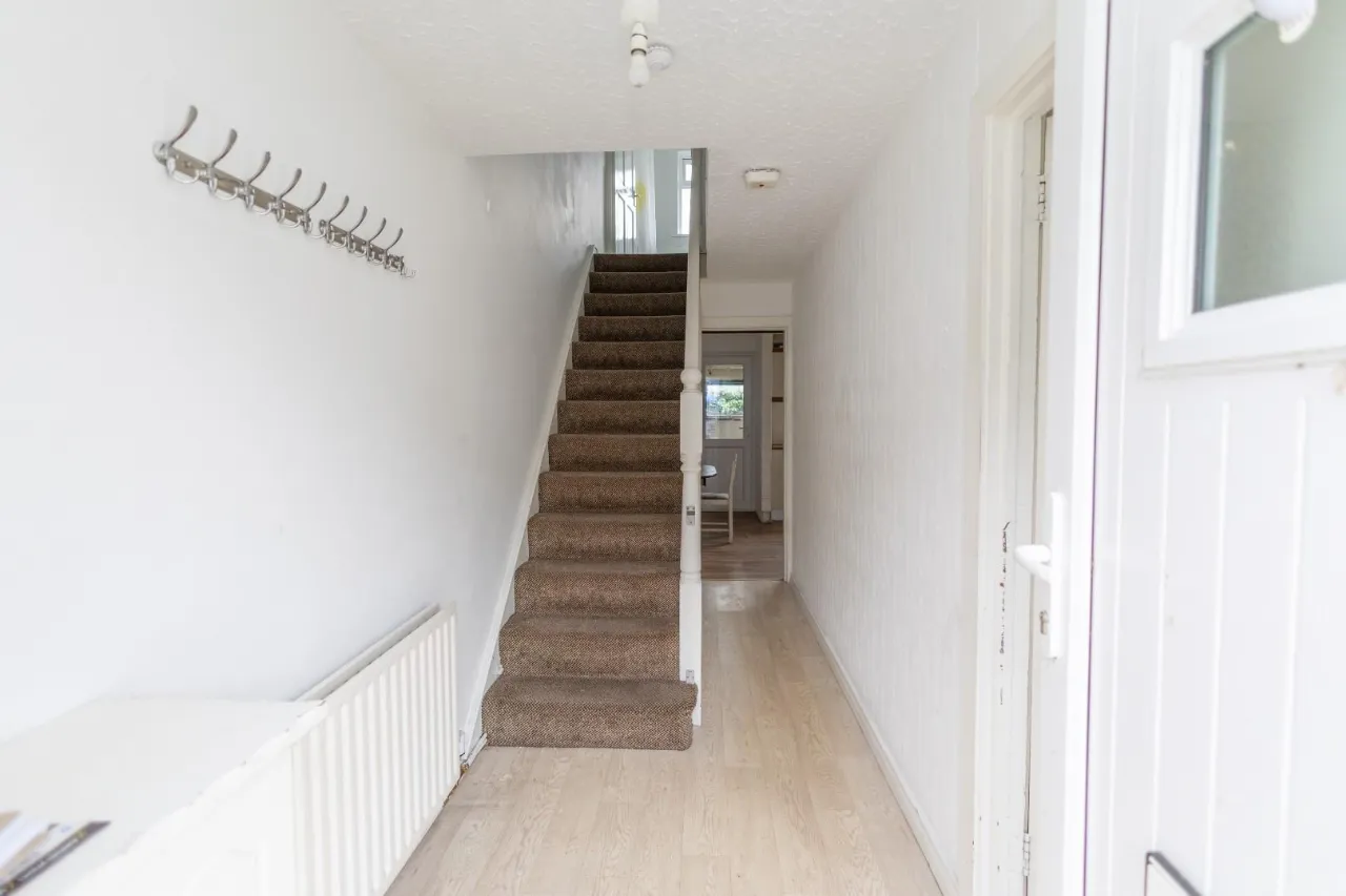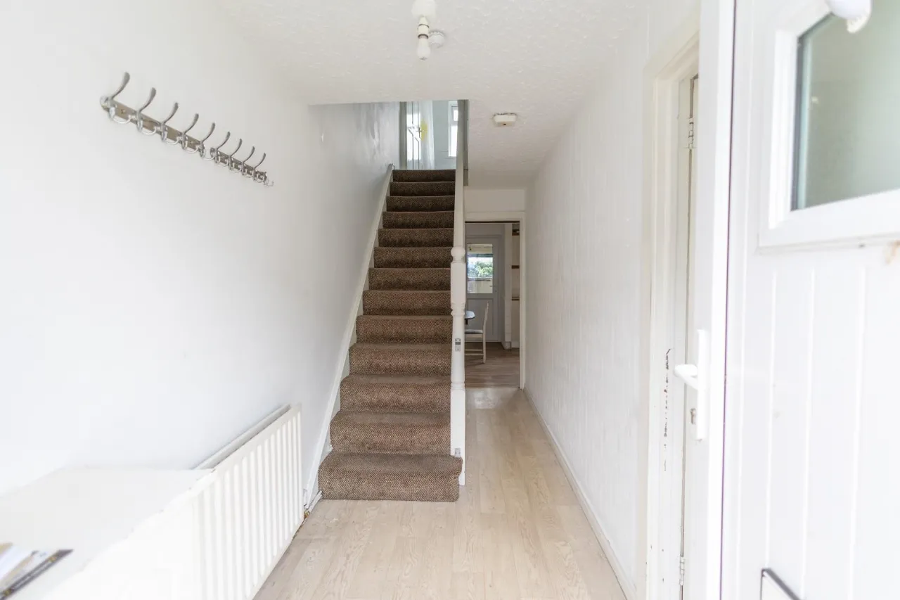 Laminate floor, Carpet stairs, Under stair storage, Composite front door.