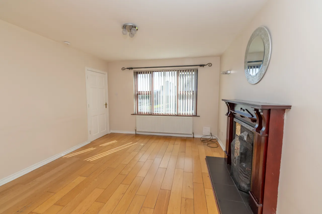 Wooden floor, wooden fire place with slate tiled hearth, radiator, window.