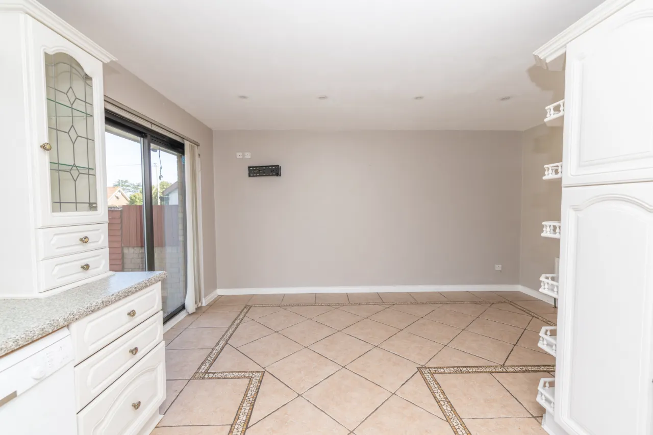 Tiled floor, high and low level storage units, sliding patio door leading to rear, electric hob and cooker.