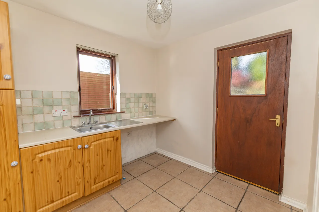 Tiled floor, high and low level storage units, sink, plumbing for washing machine.