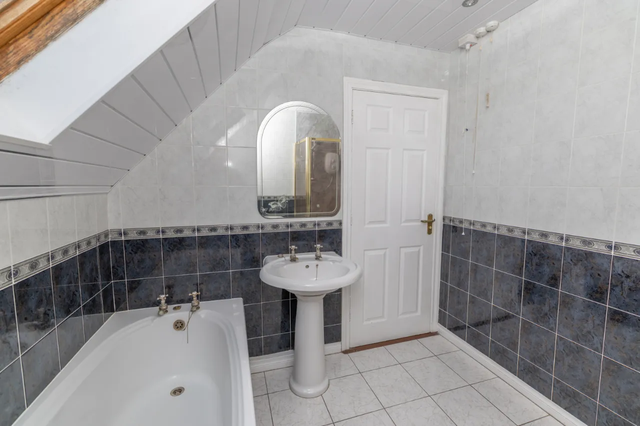Tiled surround, PVC Ceilling, seperate bath and electric shower, toilet, sink, velux window.