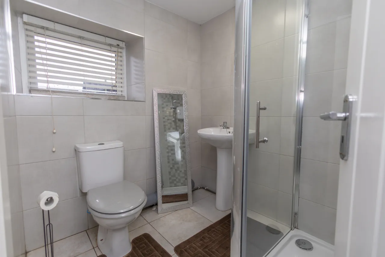 Tiled flooring and walls, stand alone electric shower and a dual flush toilet. Sink and small double glazed window.