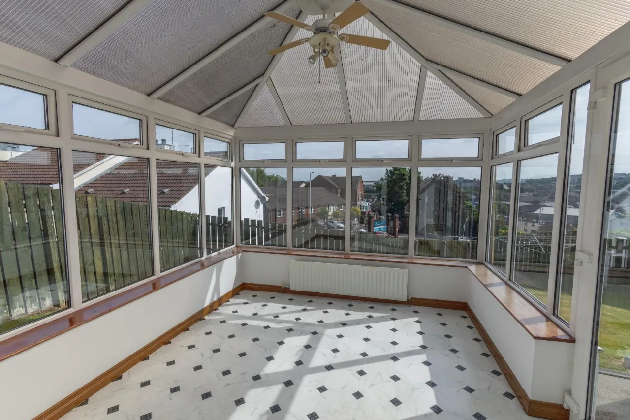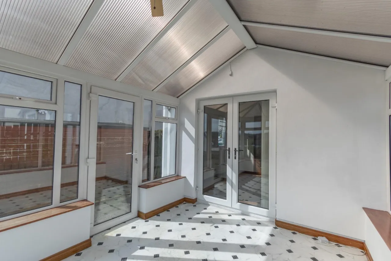 Patterned lino flooring, double glazed windows and hanging light/fan. White PVC door leading to rear of property.