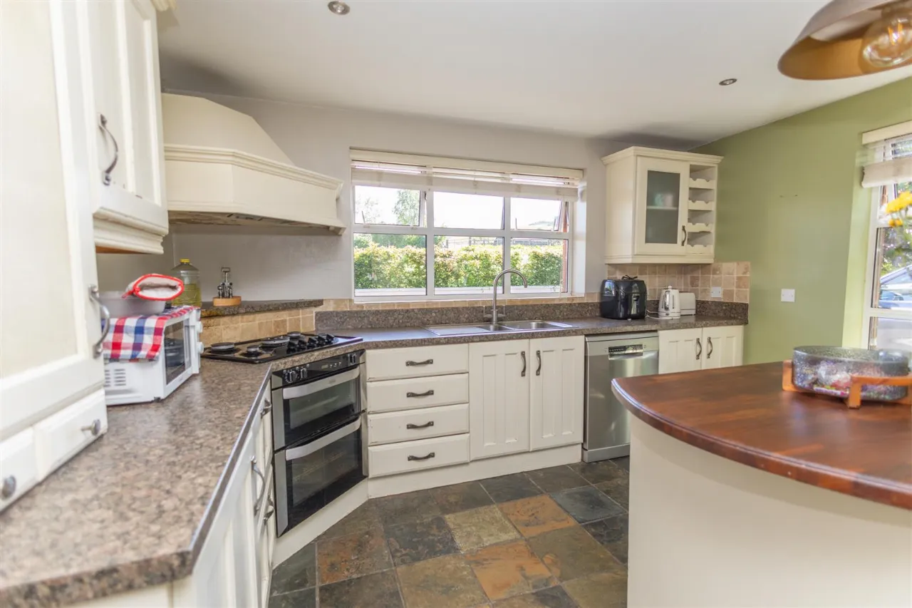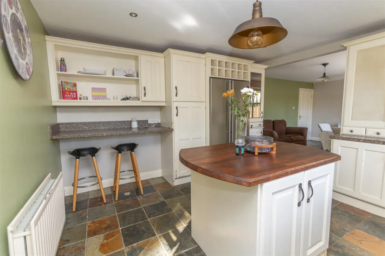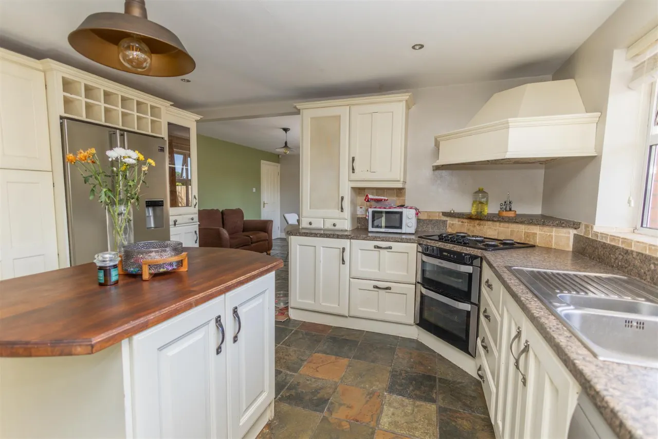 Tiled flooring. Recessed ceiling lights. High and low painted kitchen units. Granite worktop. Integrated electric oven, Gas stove, Breakfast bar, Dishwasher, Centre Island with wooden work top. Stainless steel sink.