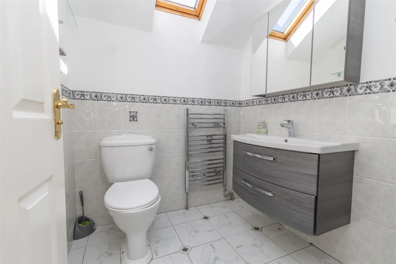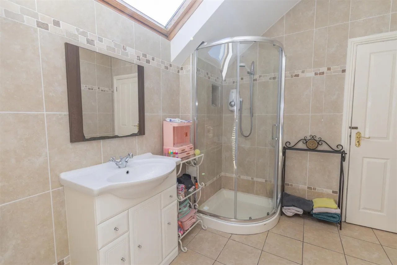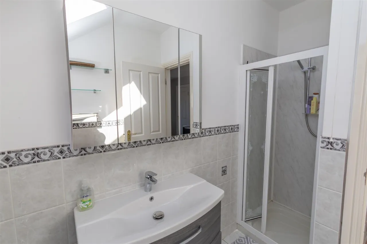Tiled flooring. Partially tiled walls with decorative border. Low flush wc. Wall mounted vanity sink with chrome mono tap. Wall mounted triple mirrored cabinet. Chrome radiator. Wall panels shower cubicle with glass doors, electric shower.