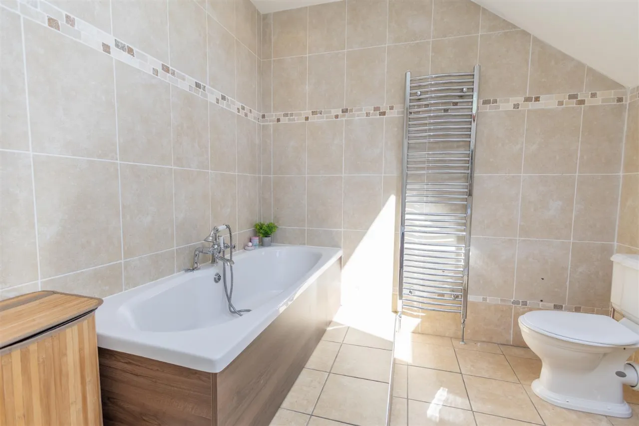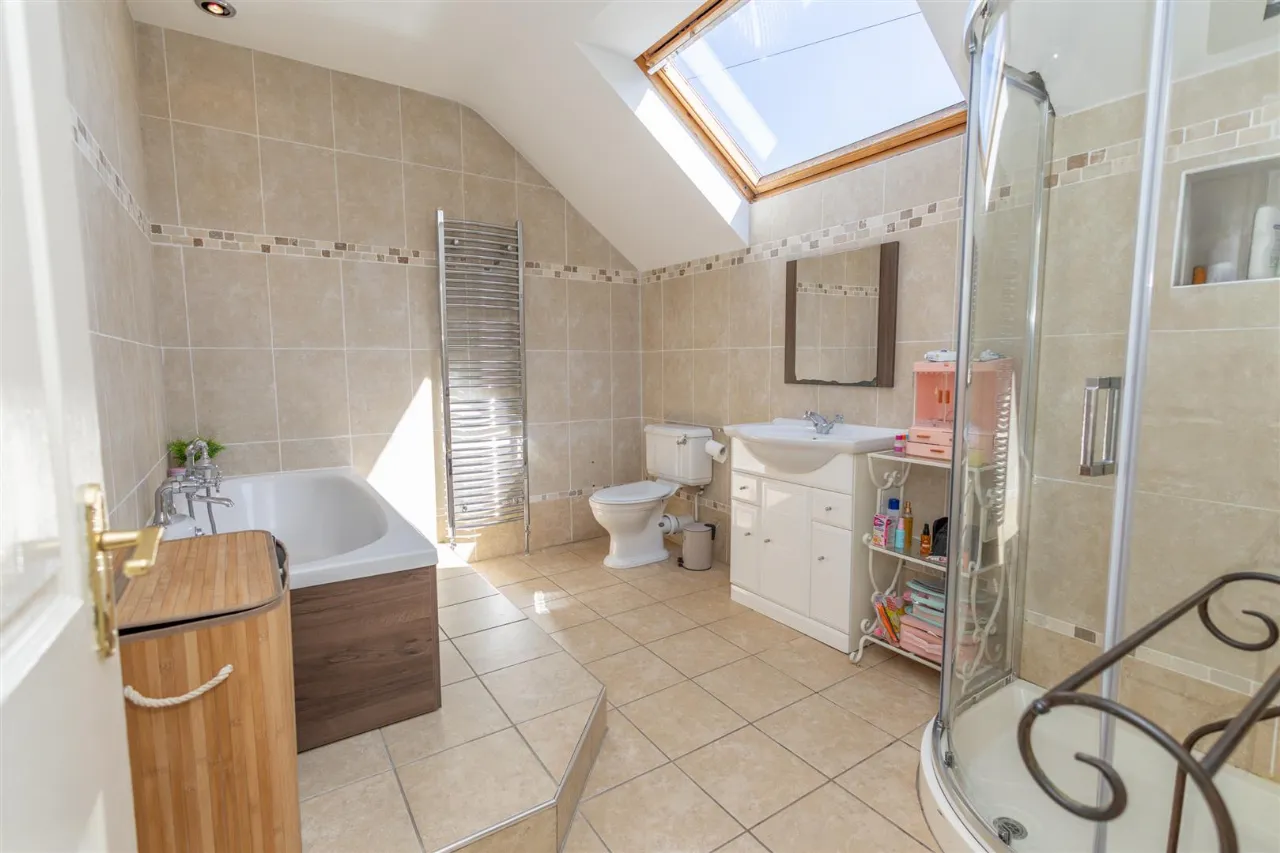 Tiled flooring. Recessed lighting. Fully tiled walls with decorative inset. Low flush wc. Raised bath with wooden surround and chrome taps and showerhead. Quadrant shower unit with electric shower. Vanity sink. Chrome radiator.
