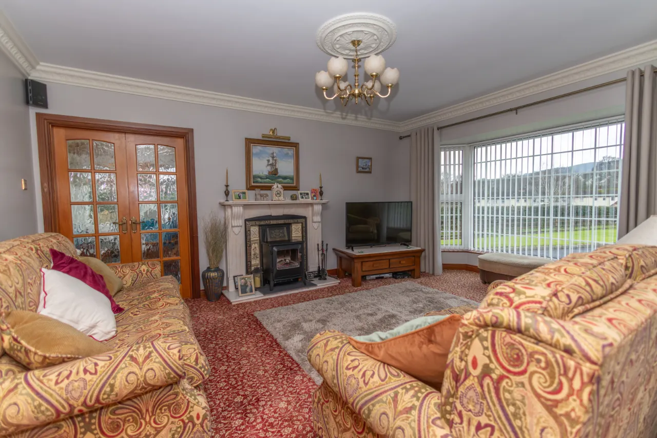 Carpet floor, decorative marble fireplace and hearth, large bay window, double doors leading to sunroom.
