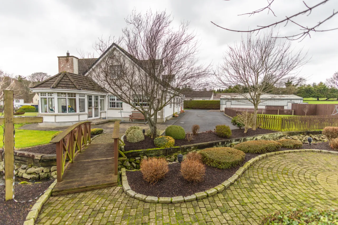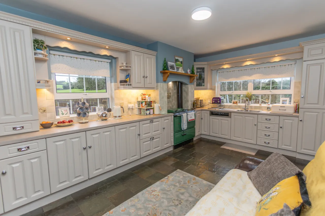 Decprative tiled floor, high and low level stoarge units with recessed down lights, tiled splashback surround, aga.