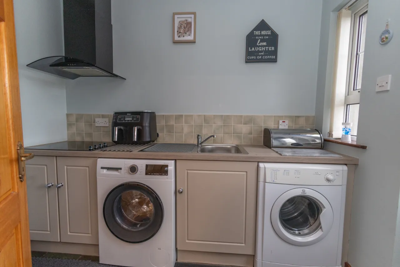 Low level storage units, sink, electric hob, extractor fan, plumbed for washing machine.