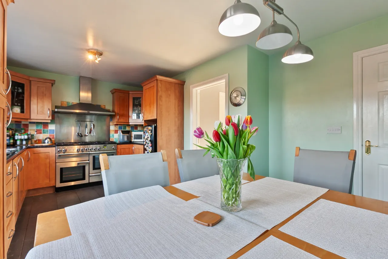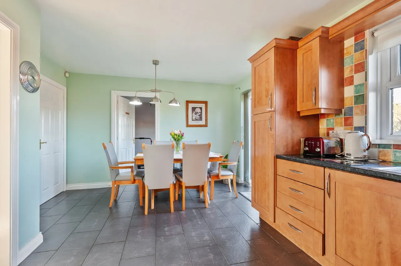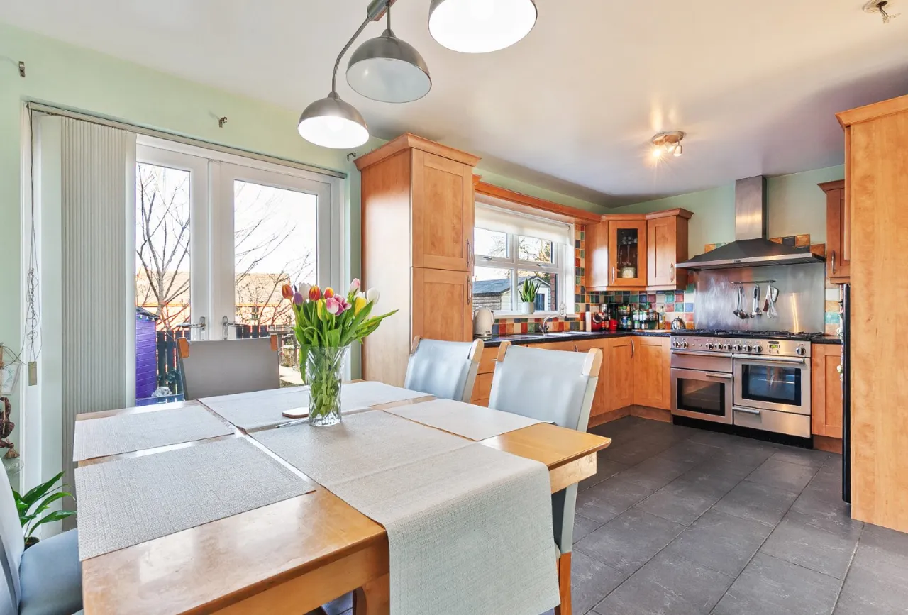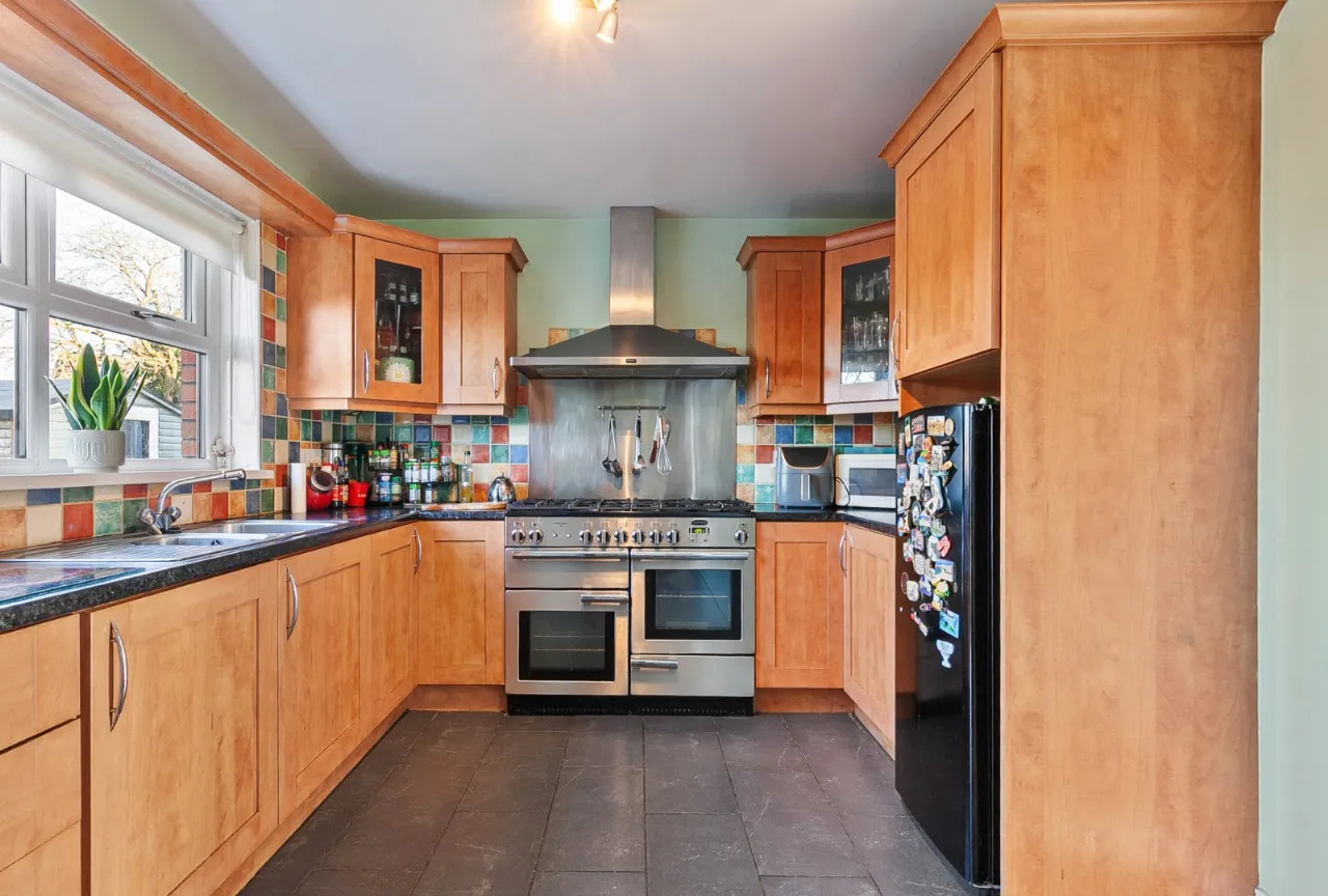 Tiled, gas cooker Rangemaster, range of high and low level units, space for fridge, hob and metal splashback, double doors to patio