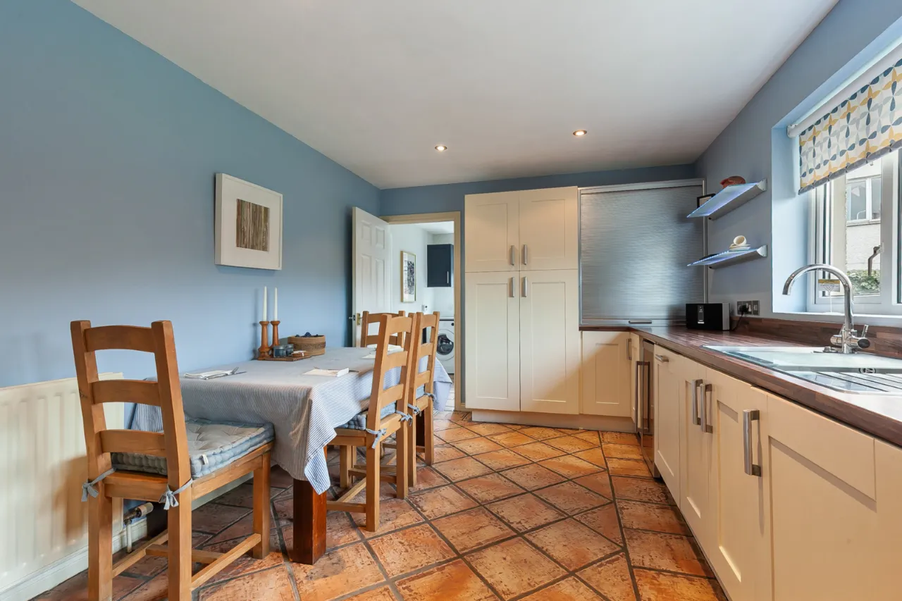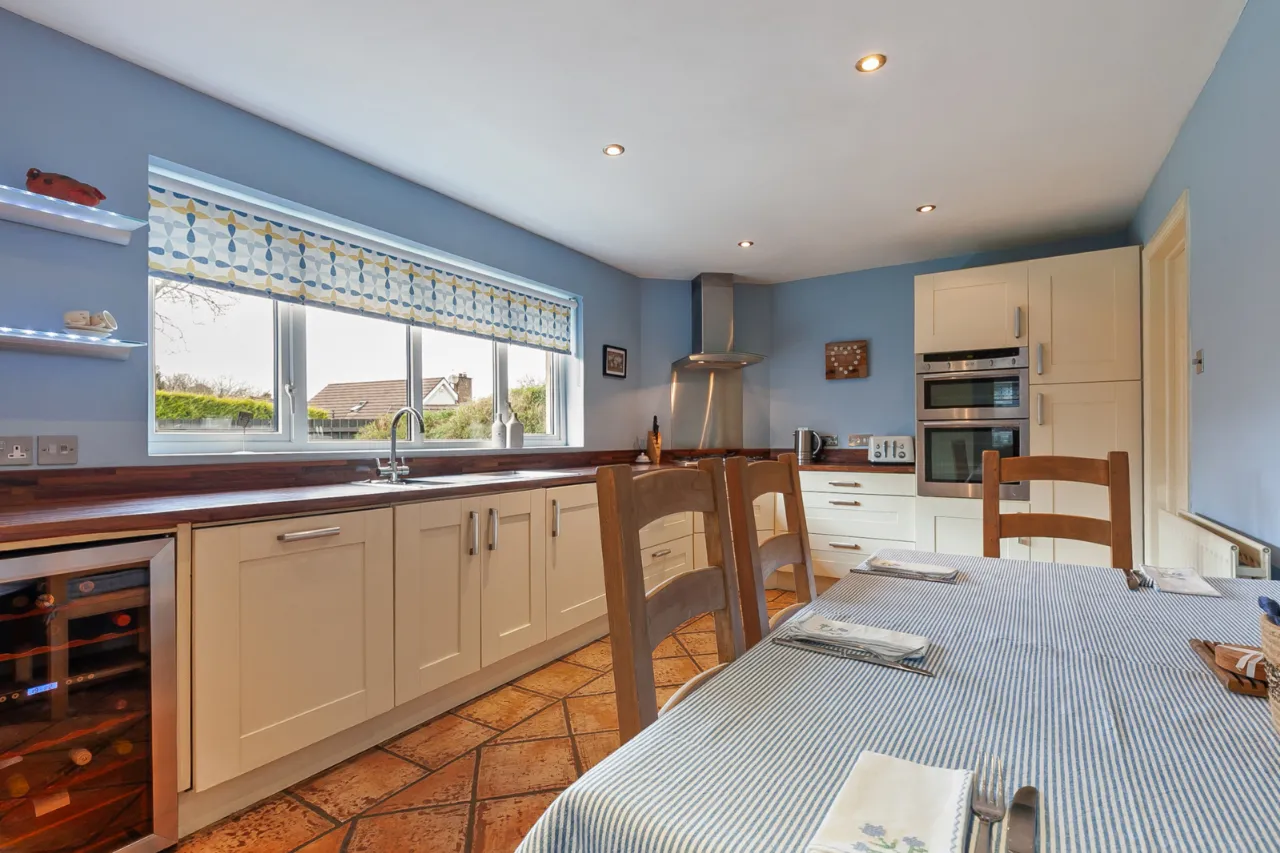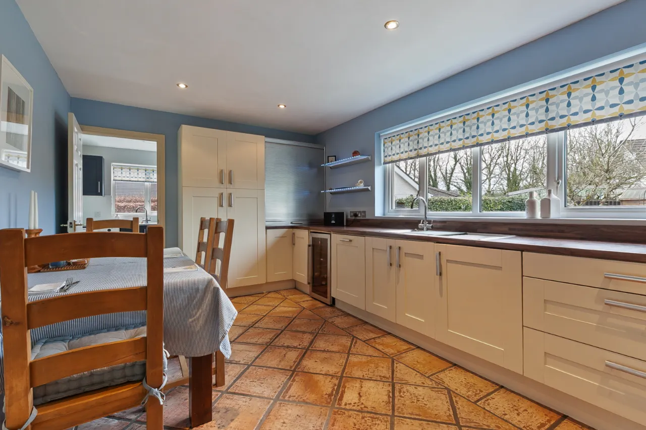 Comprises of an excellent range of high and low level units, one and a half bowl sink unit with mixer tap and drainer. Five ring gas hob with overhead extractor hood, integrated double oven and grill. Integrated dishwasher, integrated wine cooler, larder storage, tiled flooring, ample space for formal dining space and access to utility room.