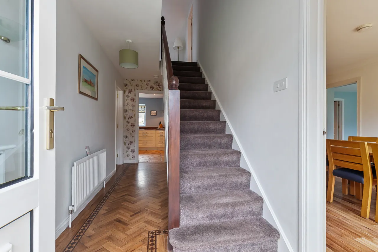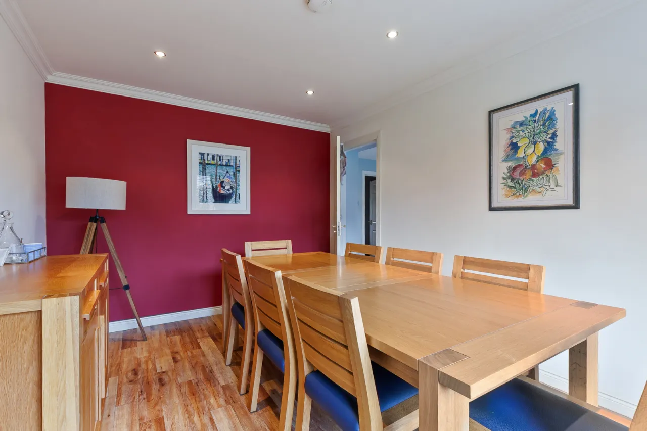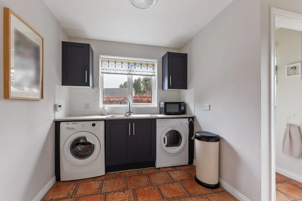 Comprises of an excellent range of high and low level units, one and a half bowl sink unit with mixer tap and drainer. Five ring gas hob with overhead extractor hood, integrated double oven and grill. Integrated dishwasher, integrated wine cooler, larder storage, tiled flooring, ample space for formal dining space and access to utility room.