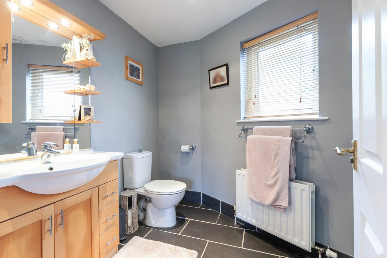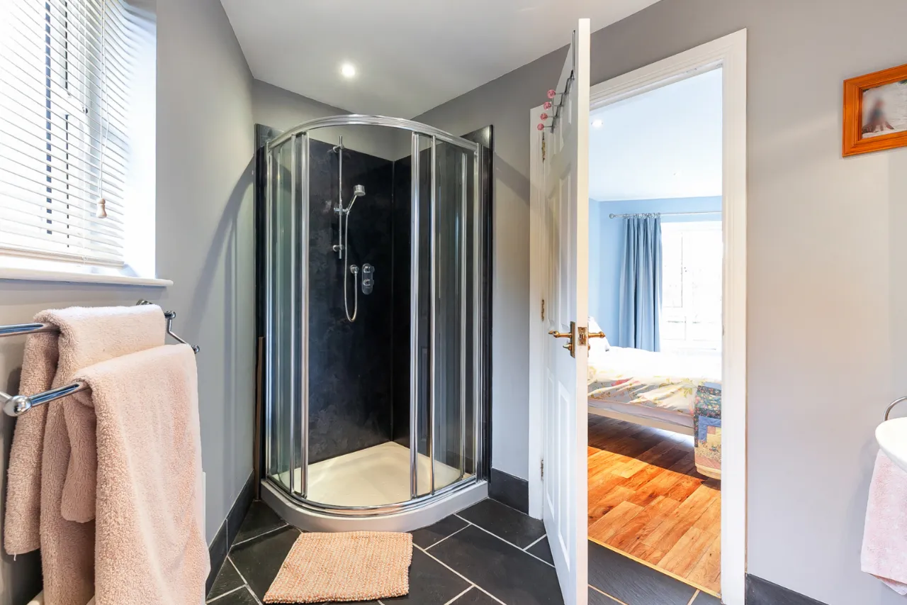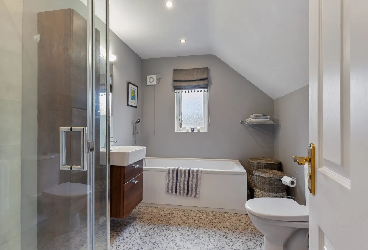 Comprises of paneled bath with telephone handle shower and mixer tap. Tiled enclosed corner shower unit with shower screen, ceramic bowl sink unit with mixer tap and vanity storage underneath. Low flush WC, recessed lighting and extractor fan.