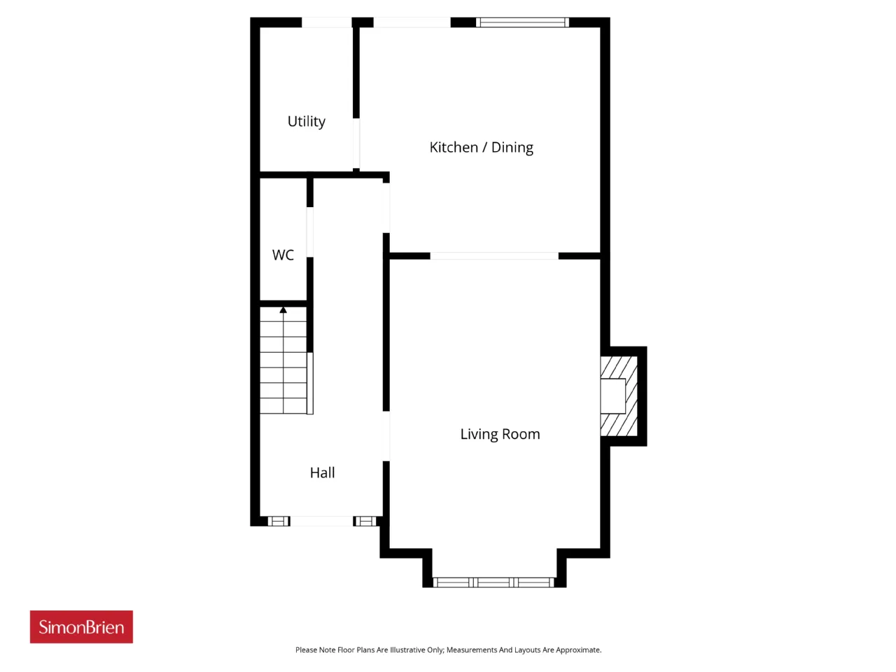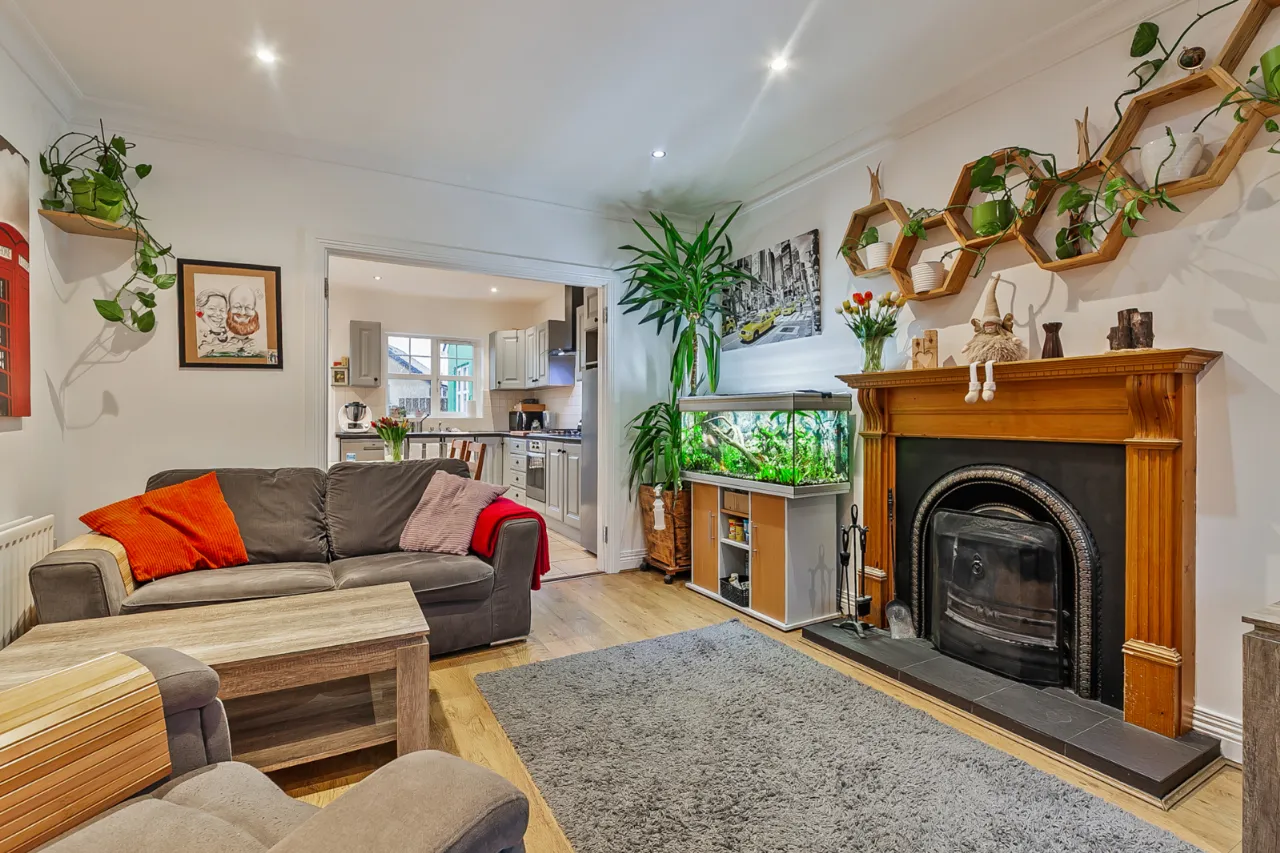Feature bay window, corniced ceiling, recessed lighting, feature open fire place, laminate wooden floor and open plan to...
