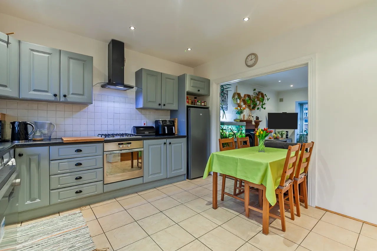 Comprises of a range of high and low level wooden units, one and a half bowl sink unit with mixer tap, four ring gas hob with overhead extractor unit and under bench oven. Plumbed for dishwasher, space for fridge and freezer, partly tiled walls, tiled floor, recessed lighting, ample formal dining space, access to rear garden and access to utility room.