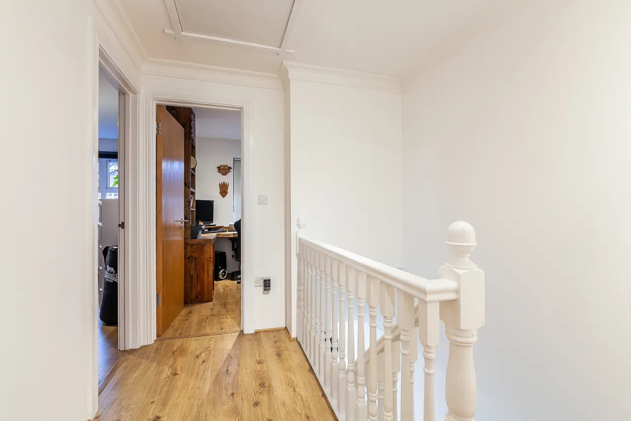 Laminate wooden floor and corniced ceiling.