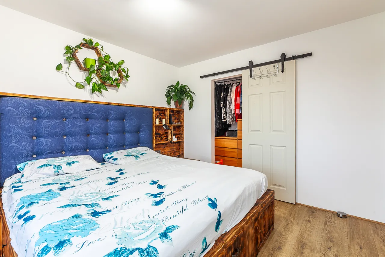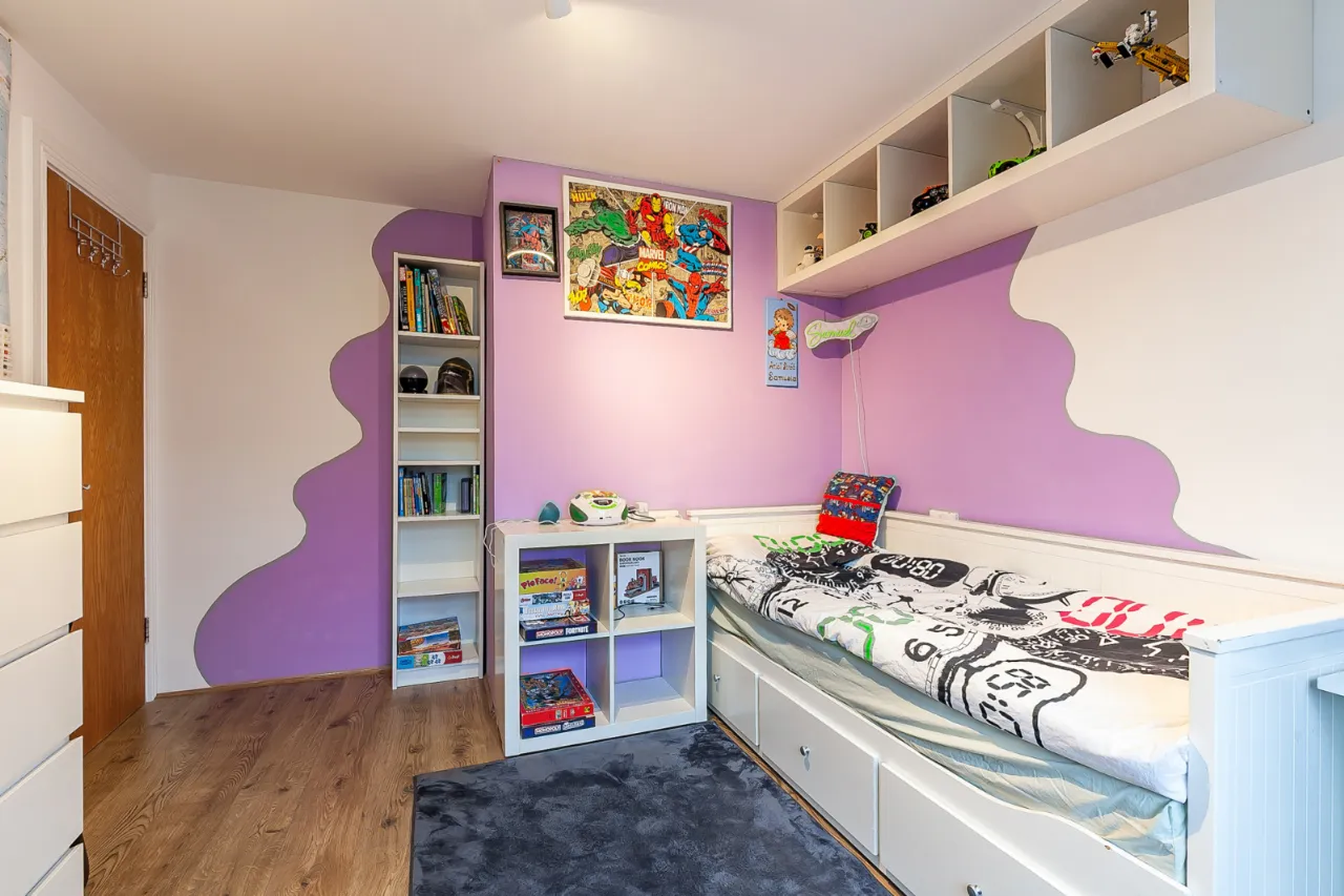 Fitted and shelved units, recessed lighting and laminate floor.