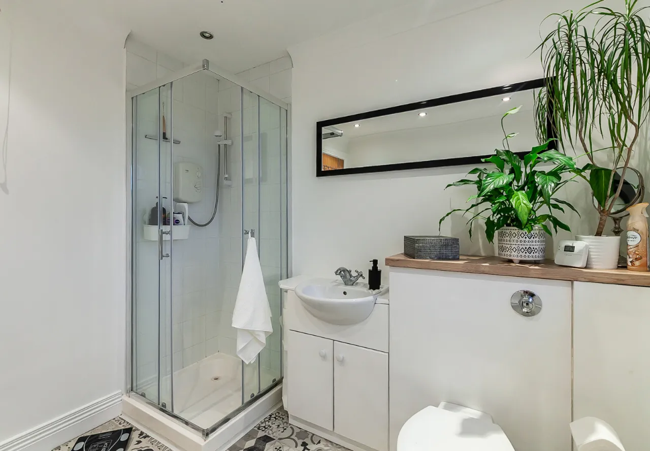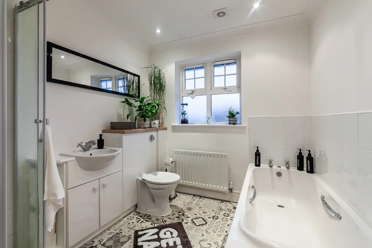 Comprises of ceramic bowl sink unit with vanity storage underneath, low flush WC, heated towel rail, partly tiled walls, tiled floor and extractor fan.
