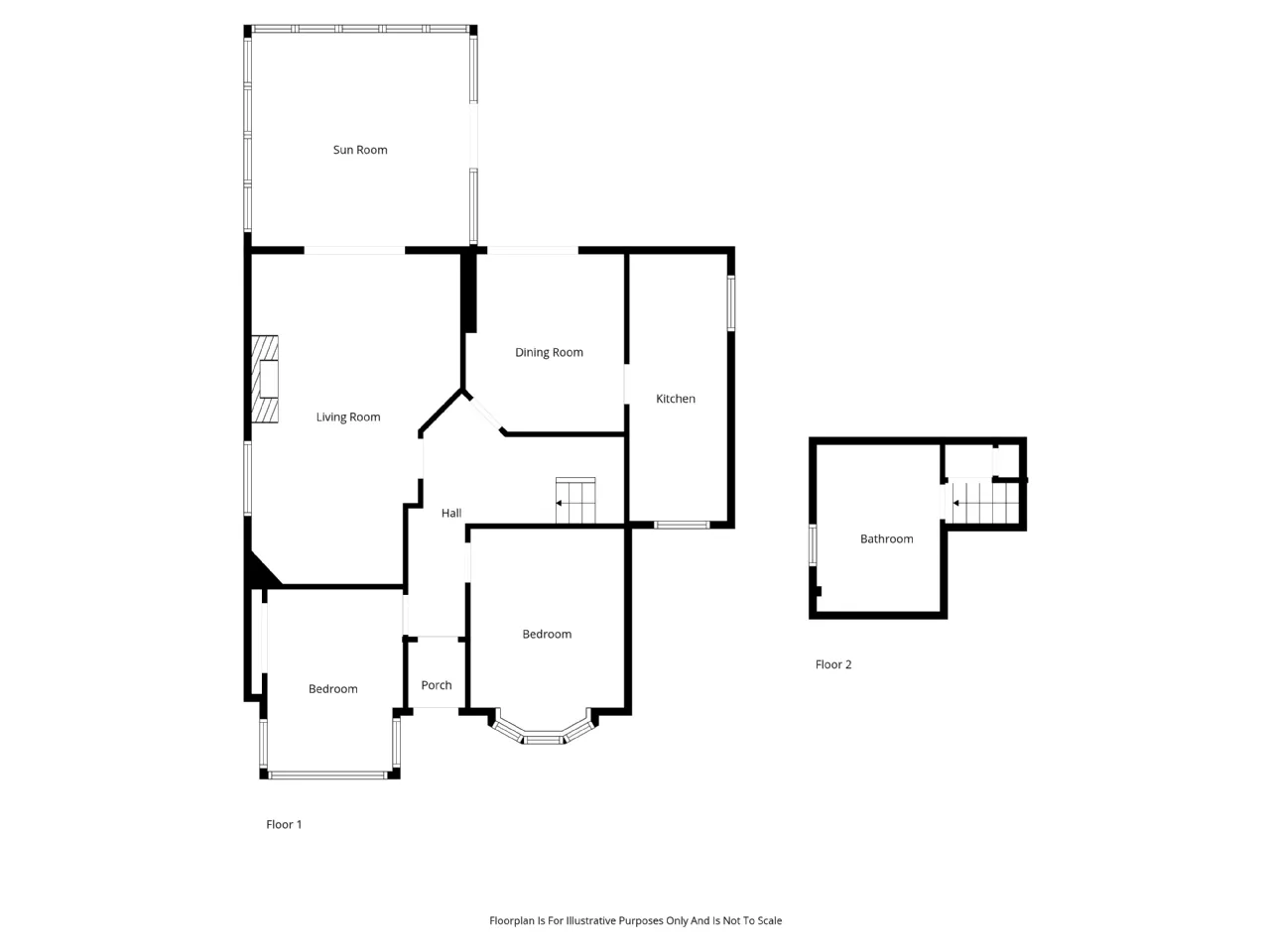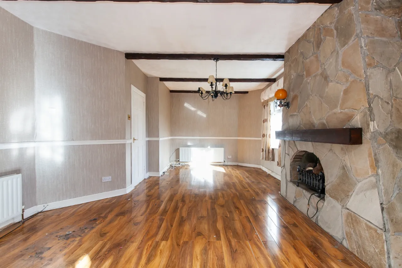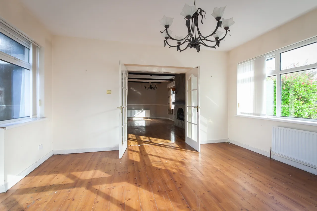 Internally, the accommodation comprises a small entrance porch leading into a central hallway, giving access to two well-proportioned front bedrooms. To the rear, a spacious main living area, complemented by a separate lounge which could serve as an additional bedroom or flexible reception space. The kitchen is positioned adjacent to a separate dining area, which provides direct access to the rear garden. A bathroom completes the internal layout.