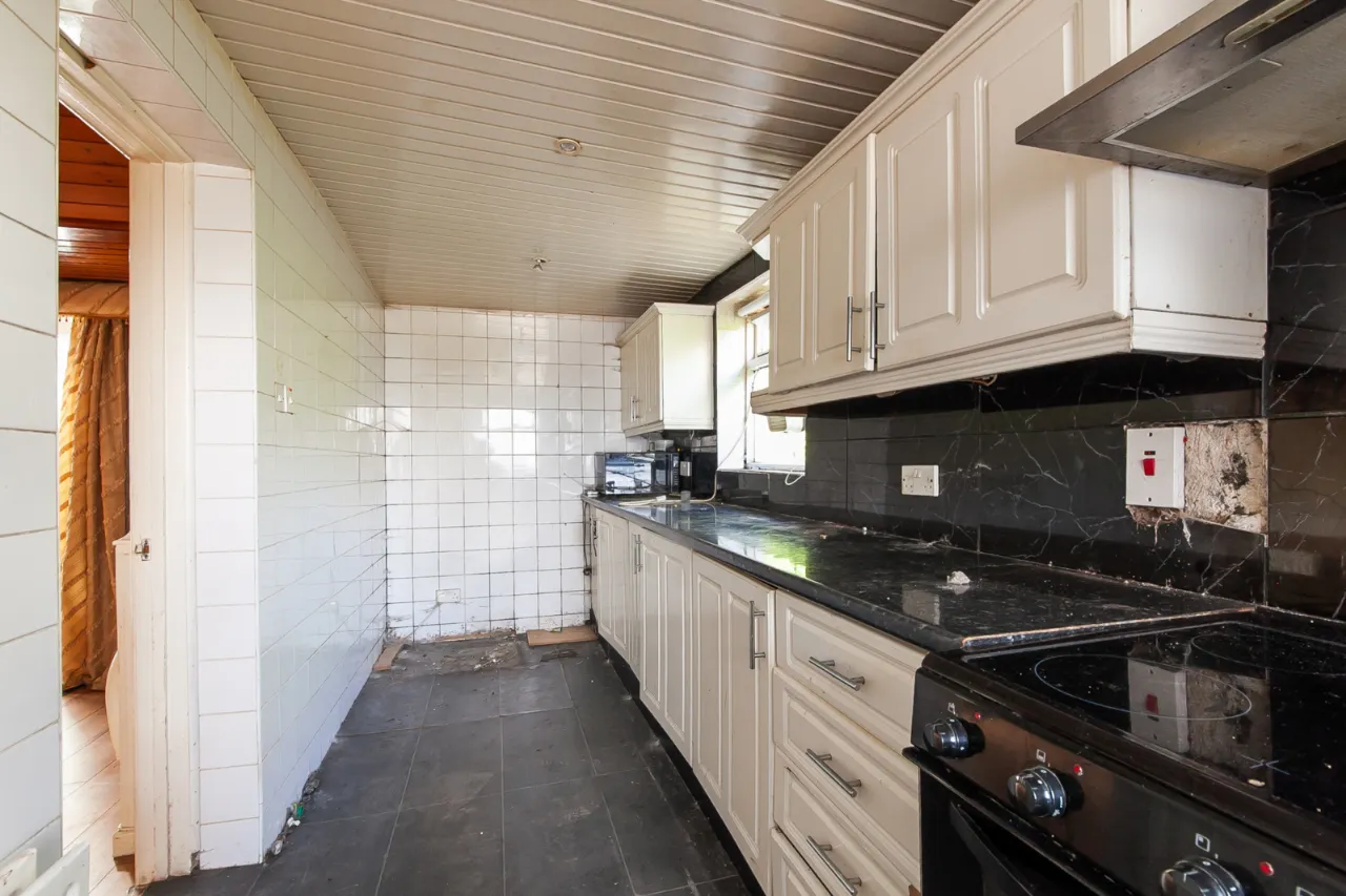 Comprises of high and low level units, space for free standing cooler, single bowl sink unit with drainer, plumbed for washing machine and tiled walls.
