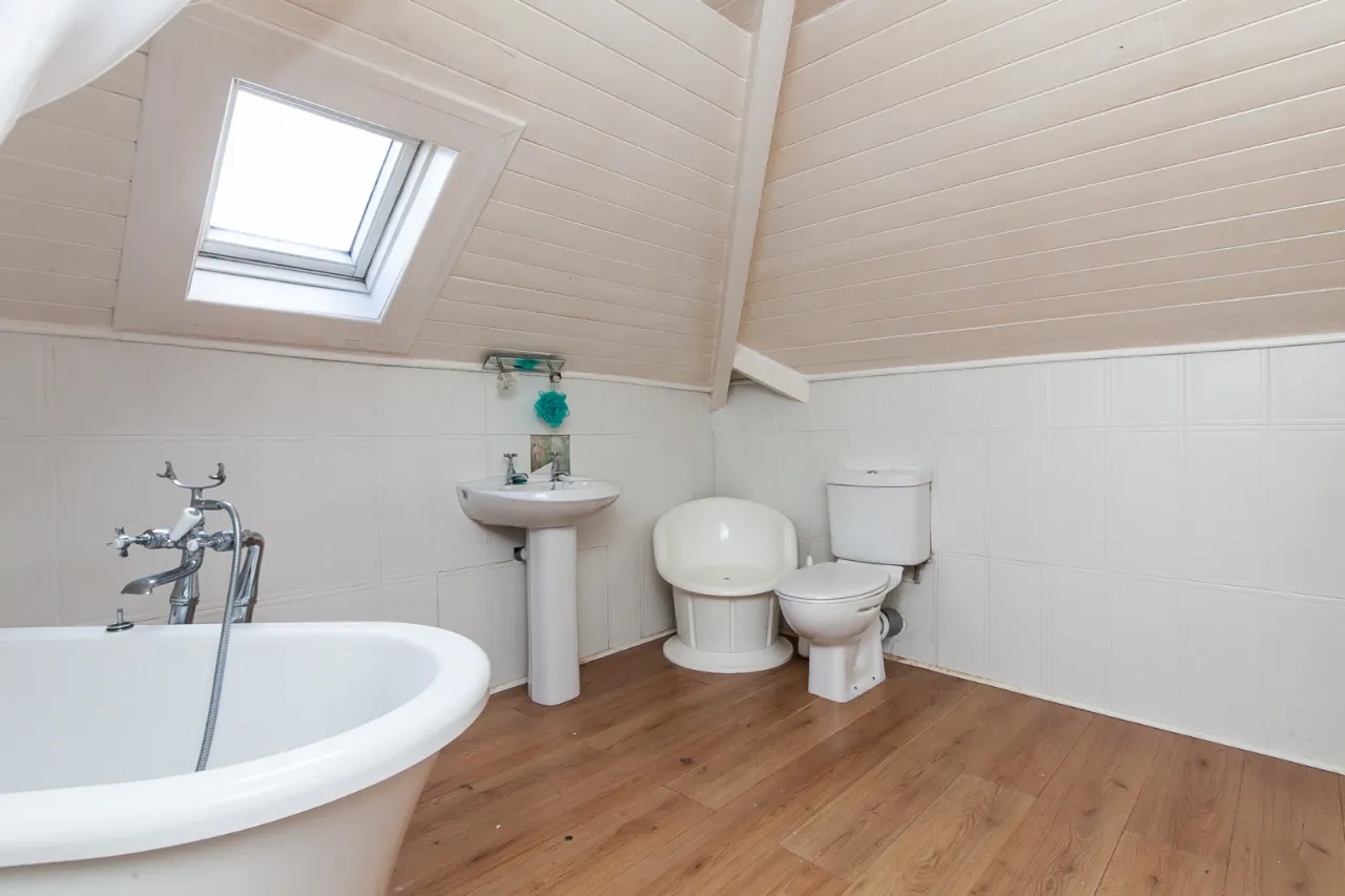 Free standing bath with telephone handle shower, low flush WC, pedestal wash hand basin with mixer tap and tiled walls.