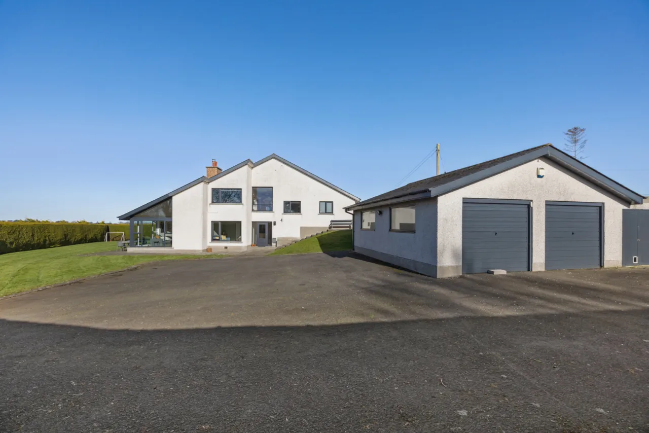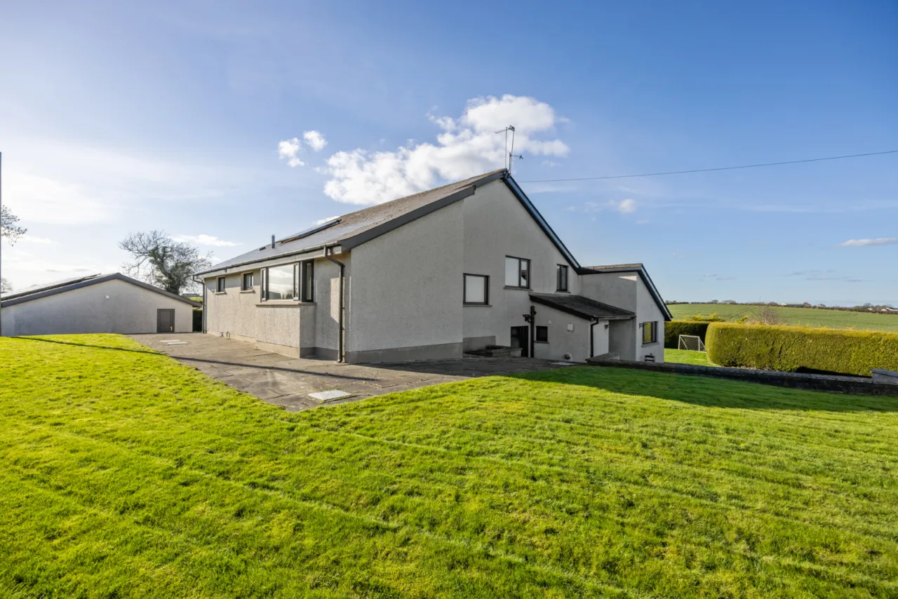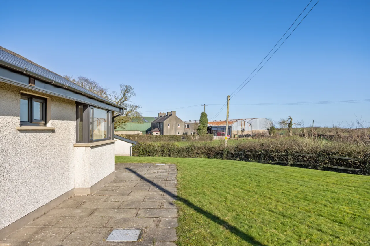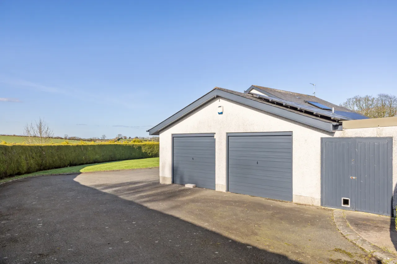 To front, side and rear laid out in lawns, three paved patio areas, hedging, coal bunkers, storage, outside lights, outside tap, dual vehicular access with two large tarmac driveways.