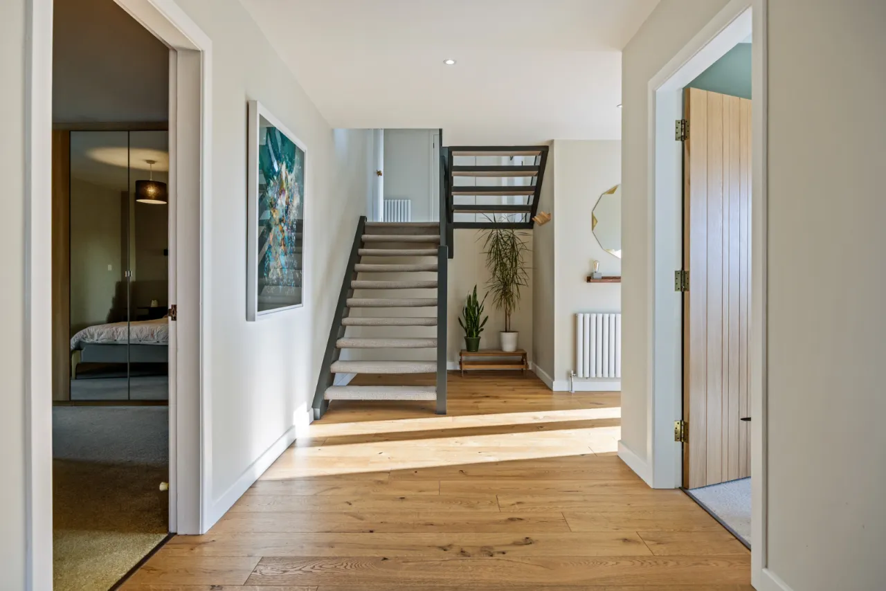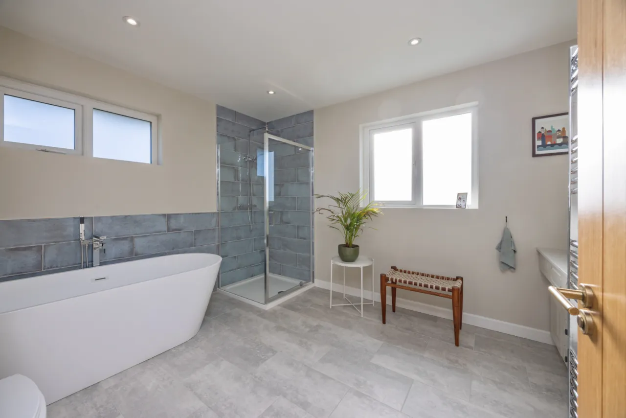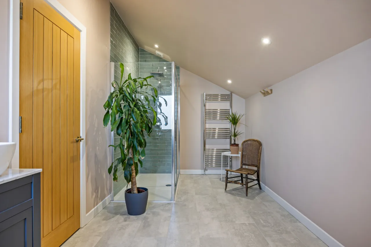Part feature tiled floor, polished engineered oak floor, LED recessed spotlights.