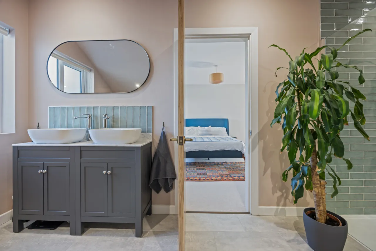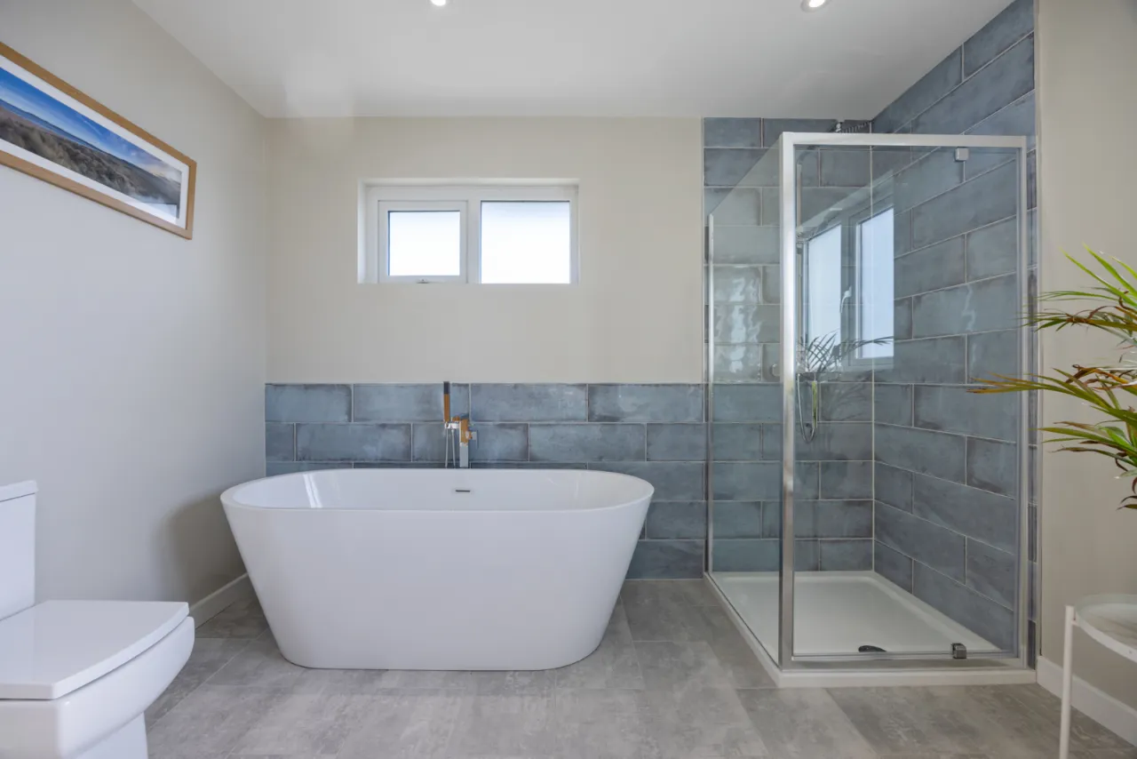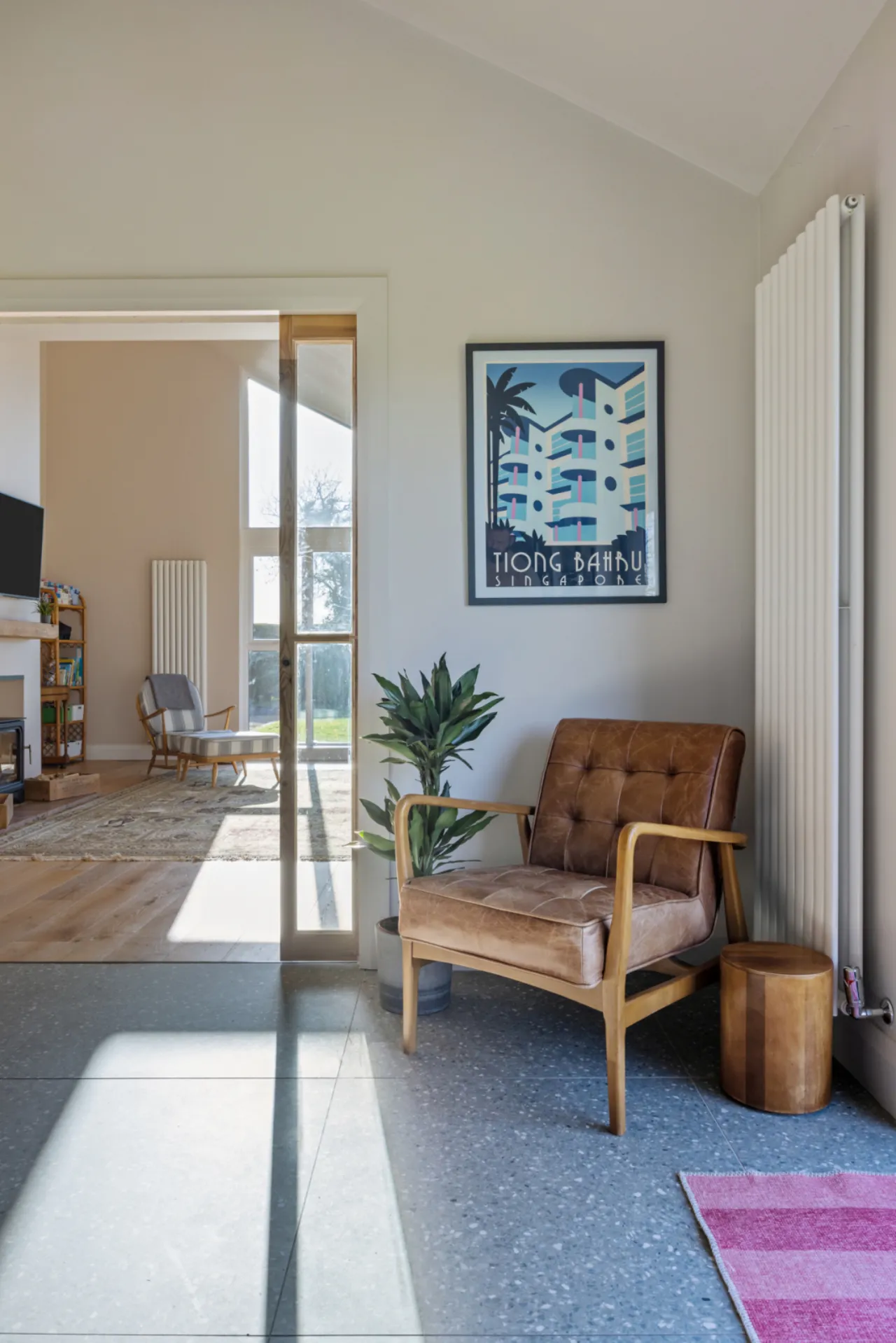 Part feature tiled floor, polished engineered oak floor, LED recessed spotlights.