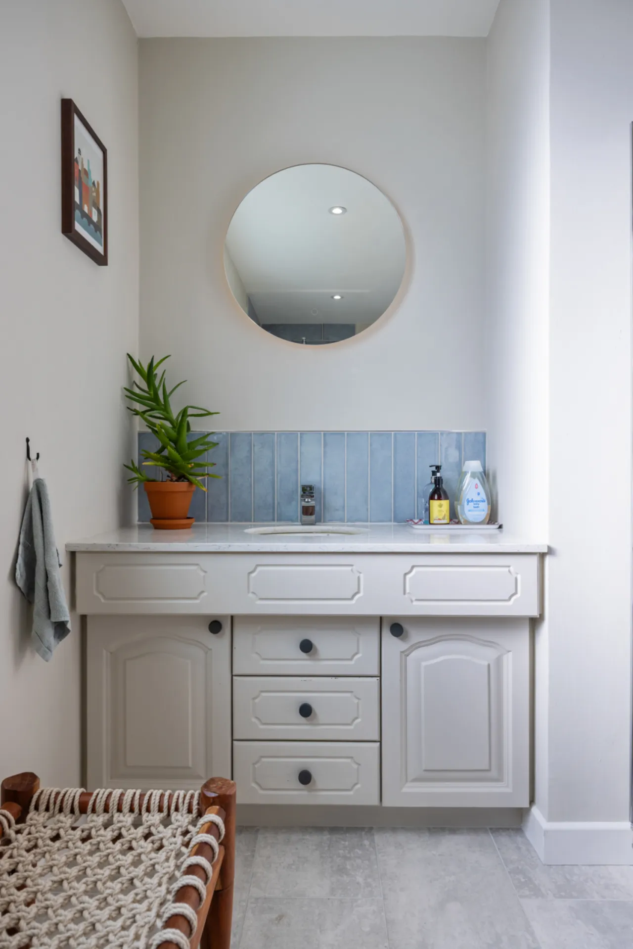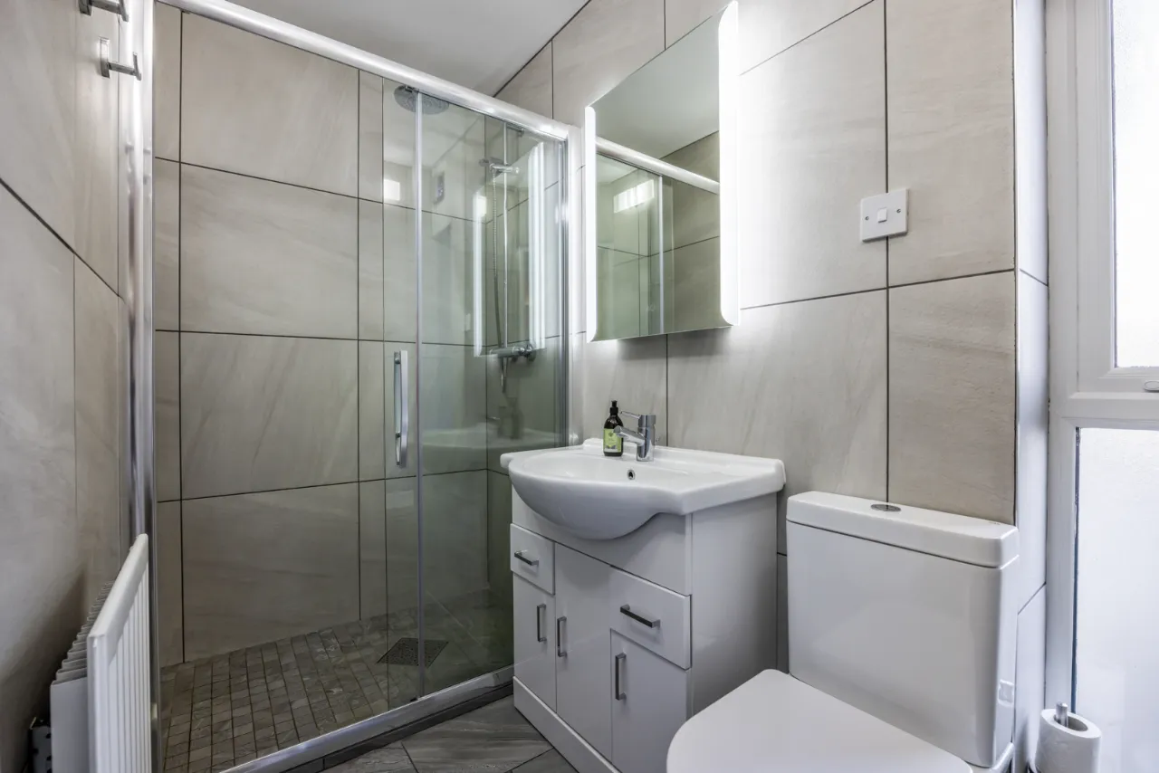 Modern white suite comprising: Separate fully tiled shower cubicle with thermostatically controlled shower, rain head and telephone hand shower, modern vanity sink unit with mixer taps, push button WC, feature tiling, ceramic tiled floor, extractor fan, chrome towel radiator.