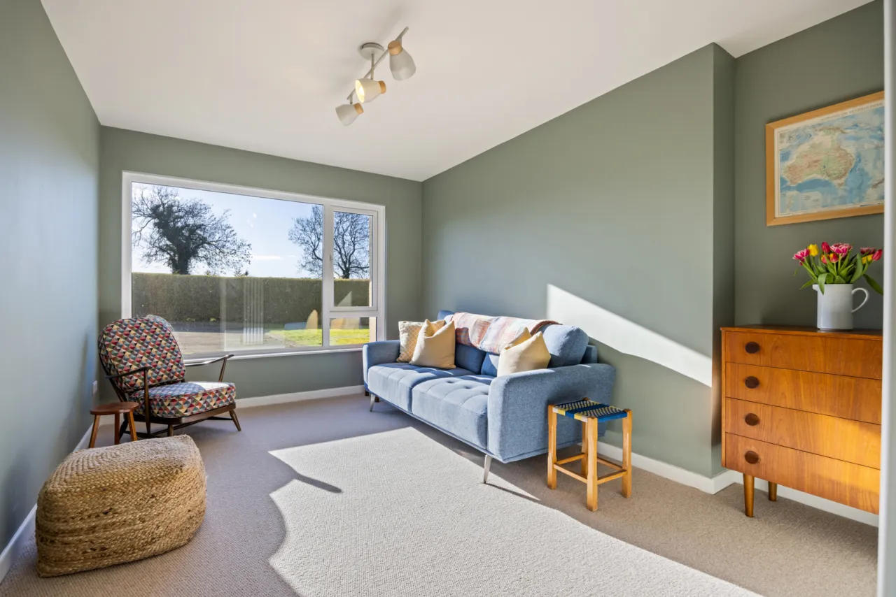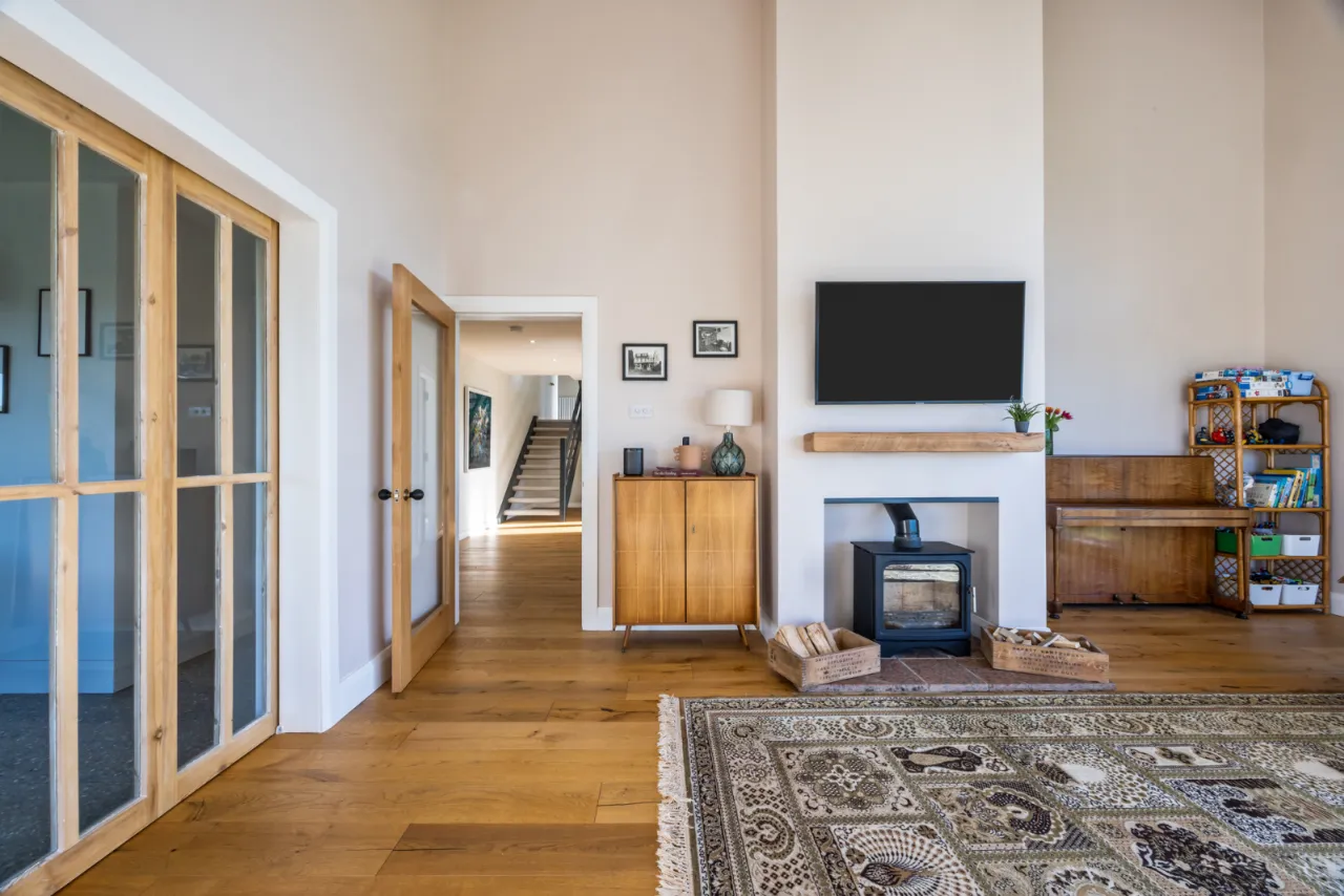 Feature vaulted ceiling, attractive fireplace, wood burning stove, floating oak sleeper mantle, granite tiled hearth, polished engineered oak floor, two vertical radiators, large corner window, views to Clandeboye Estate, twin glazed pocket doors to: