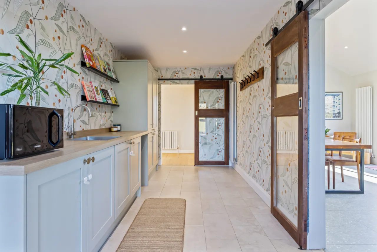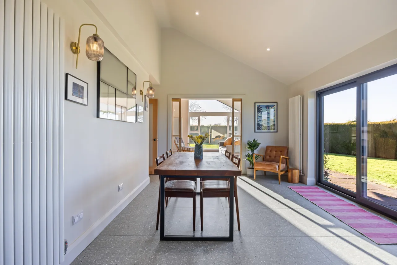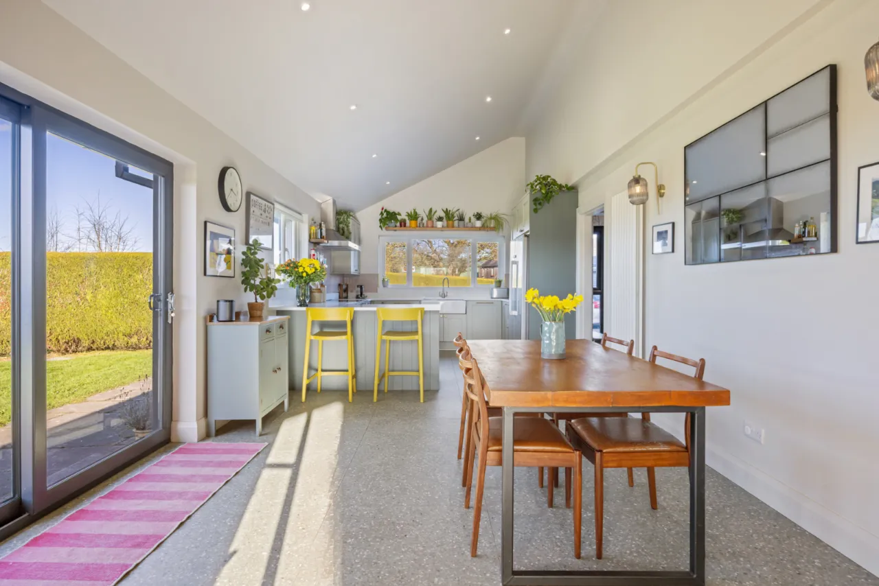 Twin tub Belfast sink with mixer taps, excellent range of high and low level 'Heritage Green' shaker style units, brass effect hardware, White Quartz worktops, freestanding Belling stainless steel 110 range cooker, Belling stainless steel extractor hood, recess for American fridge freezer, integrated dishwasher and bin storage, pull out larder, feature wall tiling, feature terrazzo style floor, vaulted ceiling, LED recessed spotlighting, dual aspect, wall light points, two vertical radiators, breakfast bar, dark grey sliding patio doors to side.