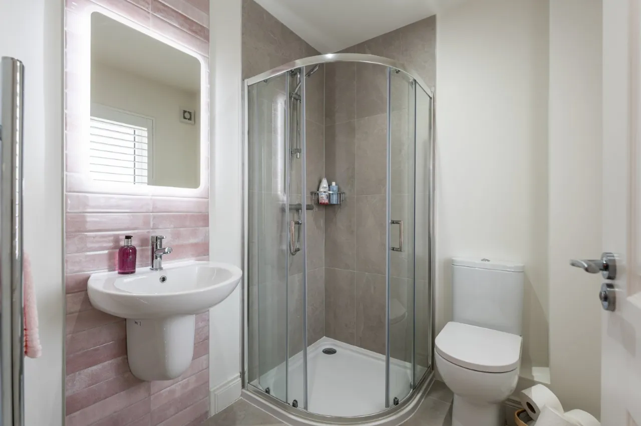 Modern white suite comprising:  Separate fully tiled shower cubicle with thermostatically controlled shower, wall mounted wash hand basin with mixer taps, push button WC, feature wall tiling, ceramic tiled floor, chrome towel radiator, LED recessed spotlighting, extractor fan, wired for wall mounted mirror.