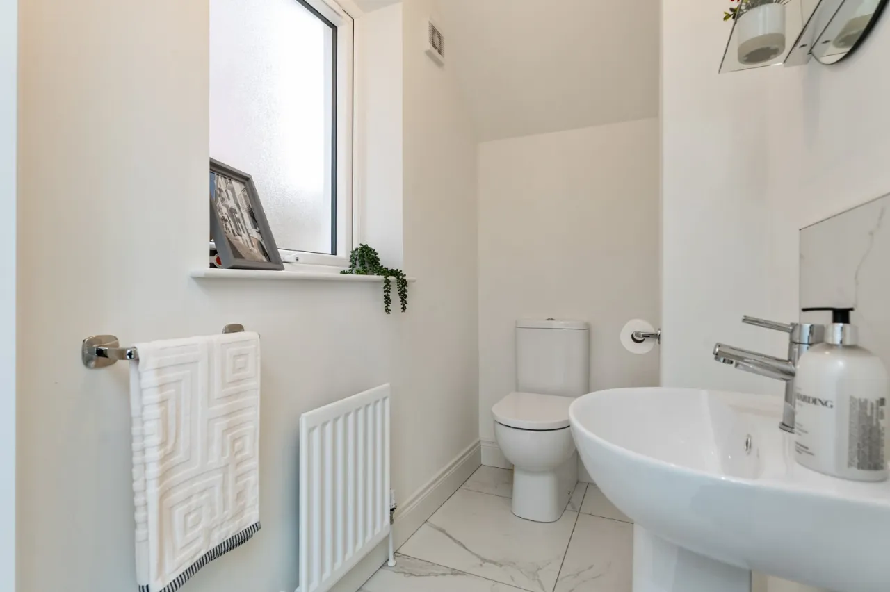 Modern white suite comprising:  Pedestal wash hand basin with mixer taps, push button WC, marble effect ceramic tiled floor, extractor fan.