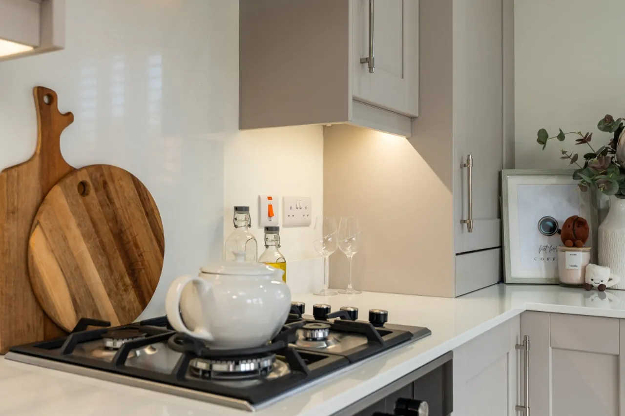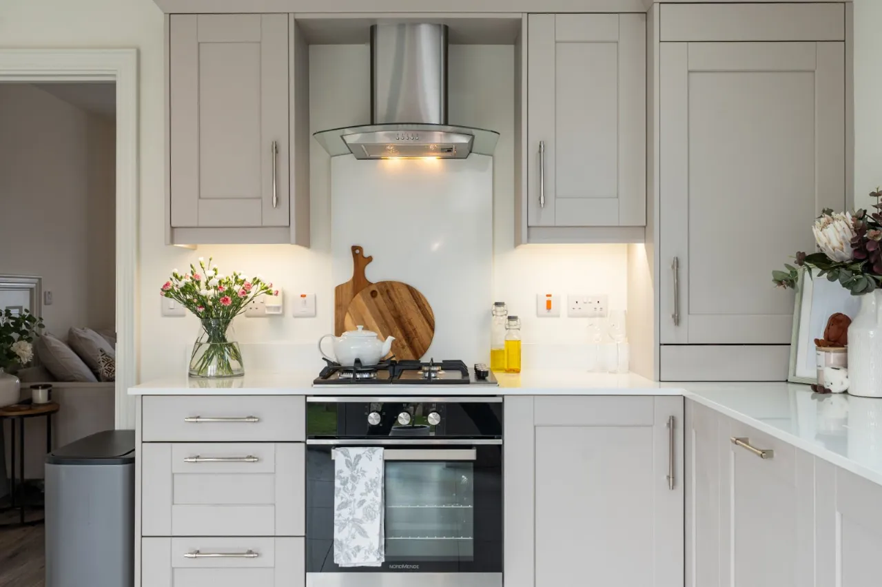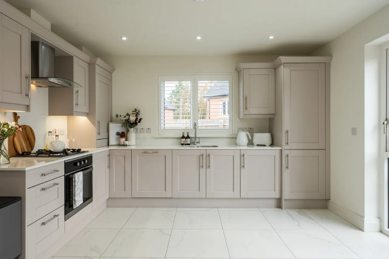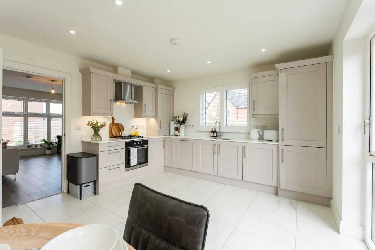 Blanco 1.5 tub stainless steel sink unit with mixer taps, excellent range of high and low level 'Cashmere' shaker style units, white Quartz work surfaces, 4 ring gas hob unit, stainless steel and glass extractor hood, built in oven, integrated fridge freezer and dishwasher and washing machine, concealed 'Worcester' Bosch gas boiler, concealed LED lighting, marble effect ceramic tiled floor, LED recessed spotlighting, wired for wall mounted TV, uPVC double glazed French doors and matching side light to rear enclosed garden.