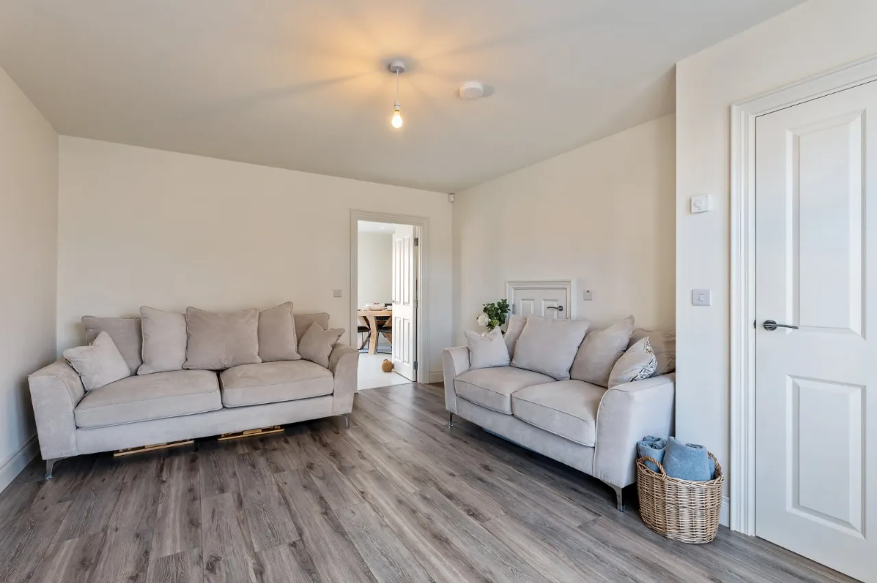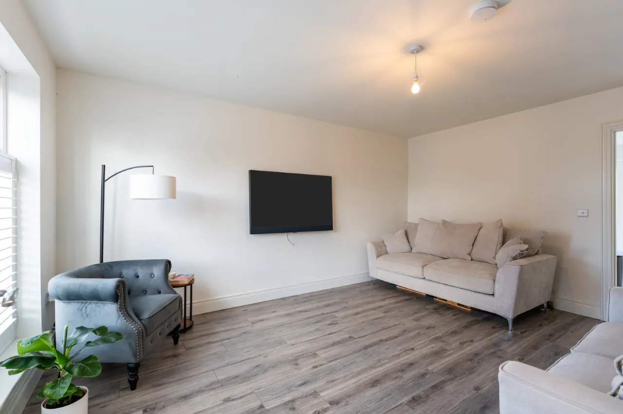 Polished laminate floor, TV and telephone points, wired for wall mounted electric fire, under stairs storage.