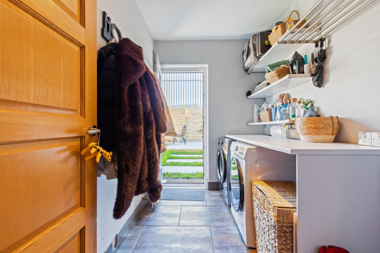 Formica roll edge work surfaces, plumbed for washing machine, ceramic tiled floor, uPVC double glazed door to rear enclosed garden.