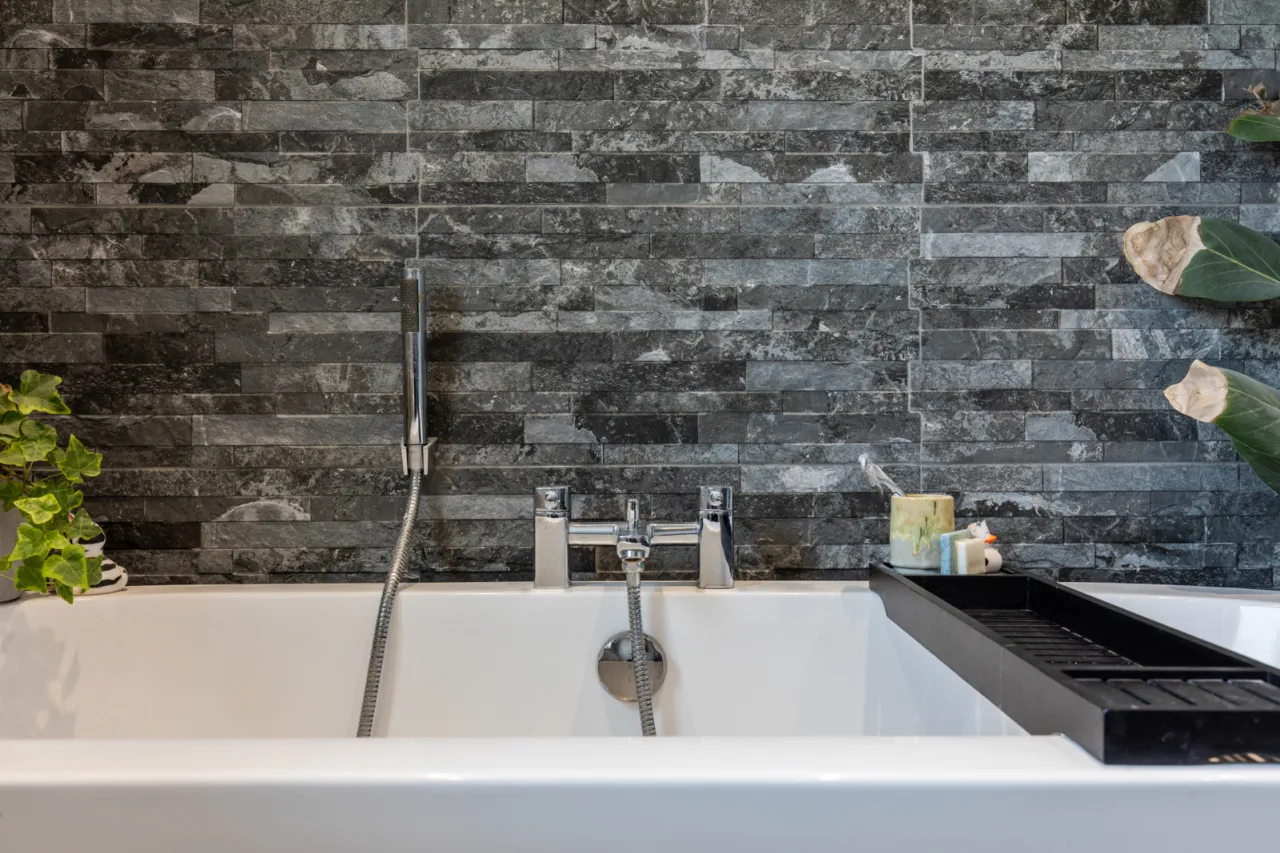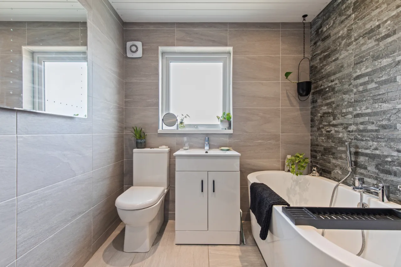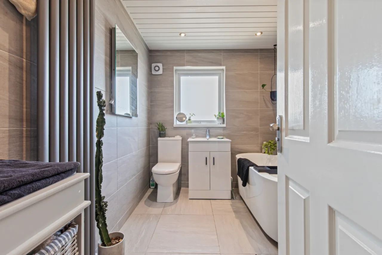 Modern white suite comprising: Freestanding bath with chrome mixer taps and telephone hand shower, separate fully tiled shower cubicle with thermostatically controlled shower, rain head and telephone hand shower, high gloss modern vanity sink unit with mixer taps, push button WC, feature vertical radiator, wired for wall mounted mirror, stone clad wall, fully tiled walls, ceramic tiled floor, LED recessed spotlighting, extractor fan.
