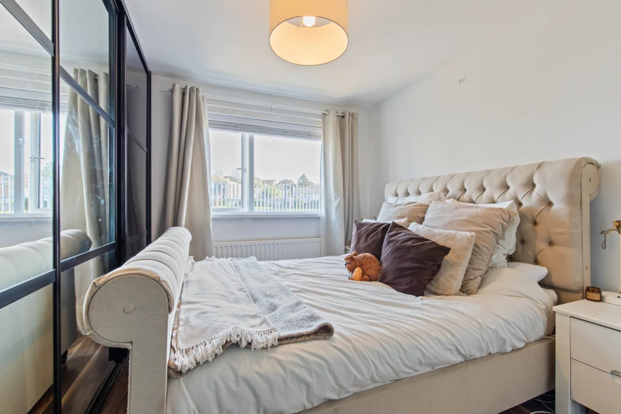 Excellent range of modern full width slide robes, polished laminate floor.