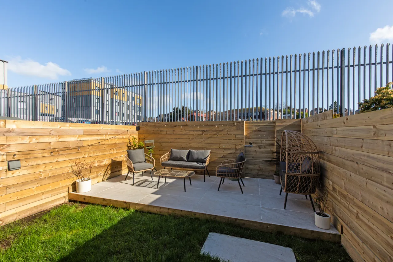 Gardens to front and rear in enclosed gardens laid out in lawn, stone paved path and feature raised patio, venetian style fencing to rear, outside light, outside water tap, access to rear for pedestrians, outdoor power socket.