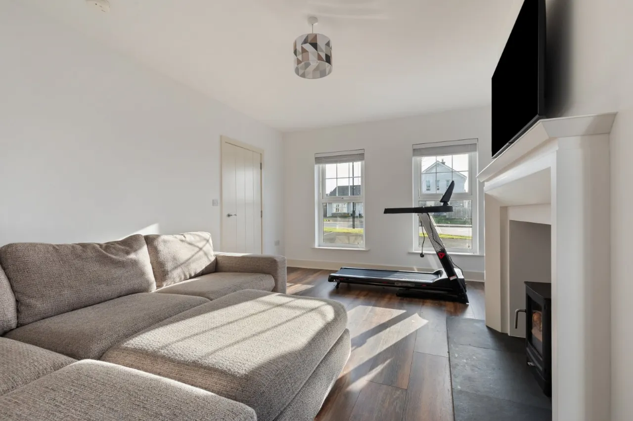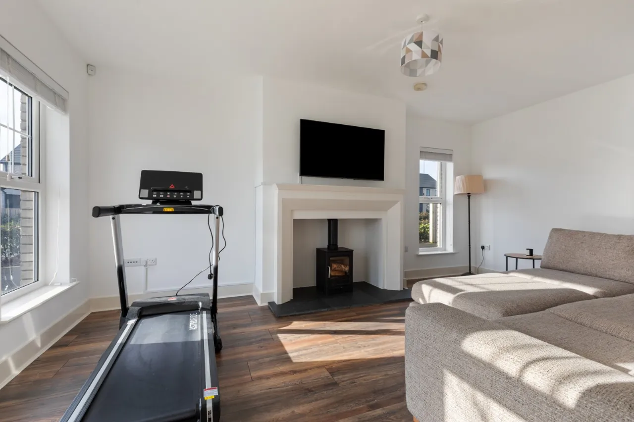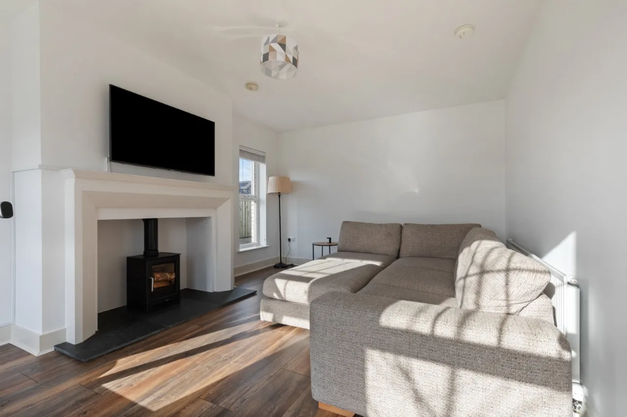 Attractive Inglenook style painted fireplace surround, wood burning stove, slate hearth, polished laminate floor, TV and telephone points, dual aspect.