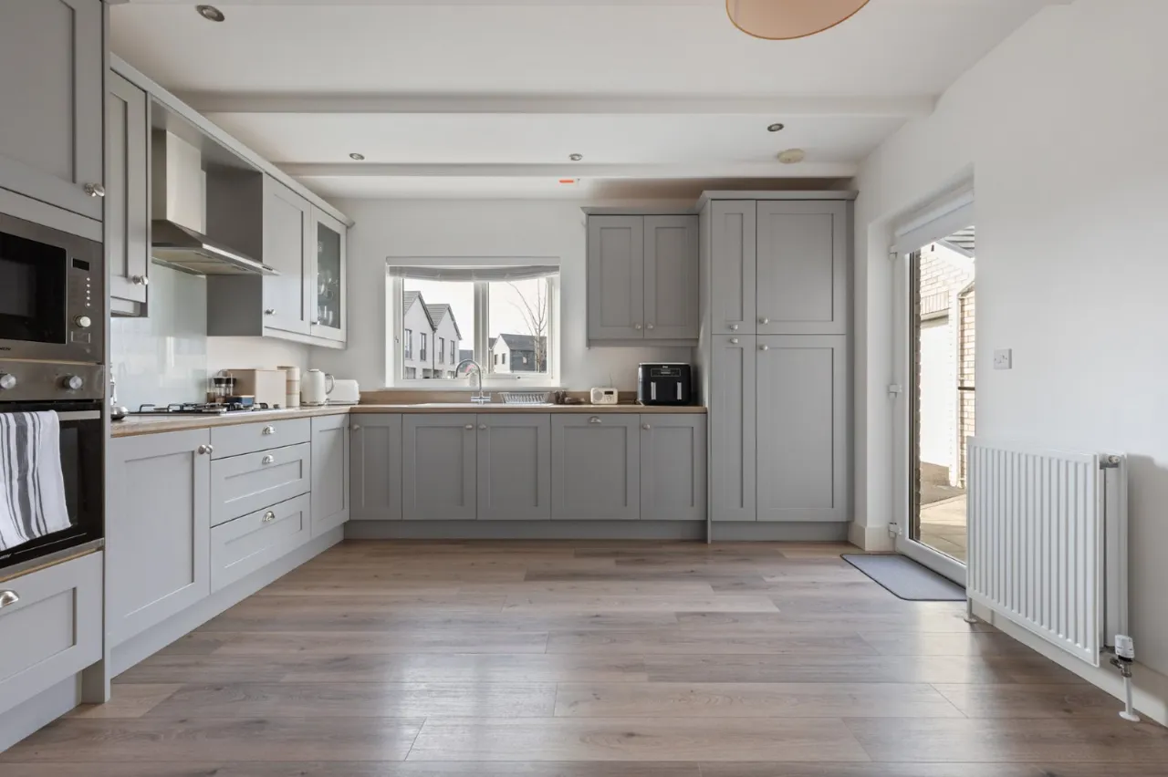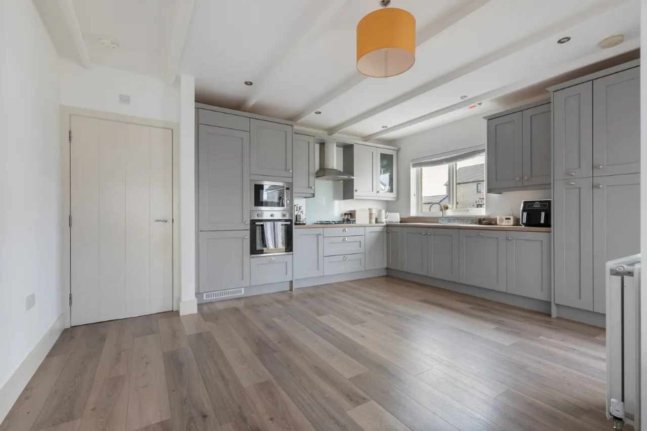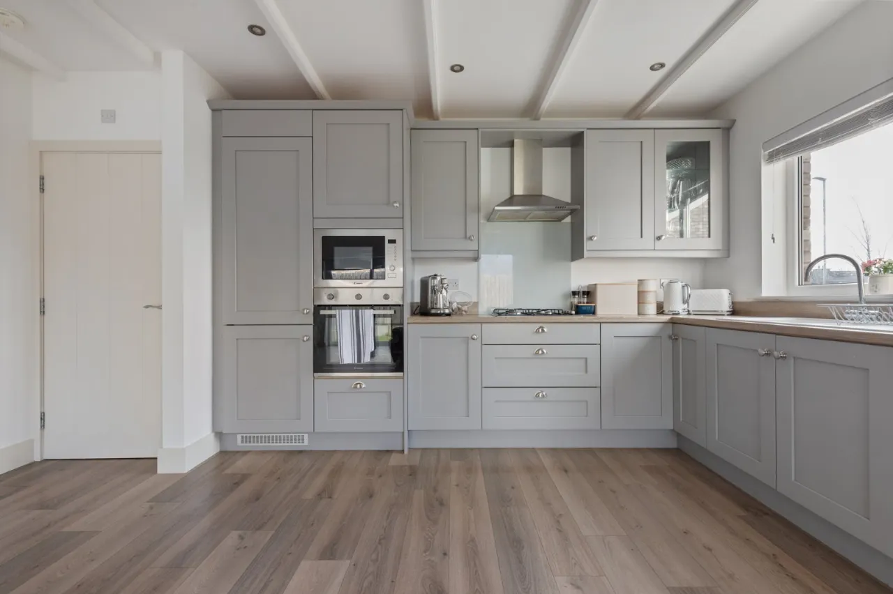 Range of high and low level light grey shaker style units, wood effect Formica roll edge work surfaces, integrated washer dryer, period style ceramic tiled floor, LED recessed spotlighting, extractor fan.