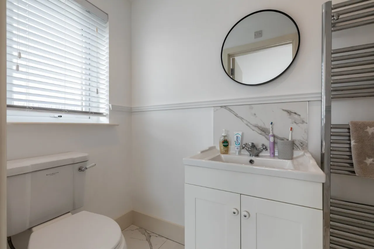 Traditional style white suite comprising: wall mounted wash hand basin, low flush WC, wood panelling, period style ceramic tiled floor, extractor fan.