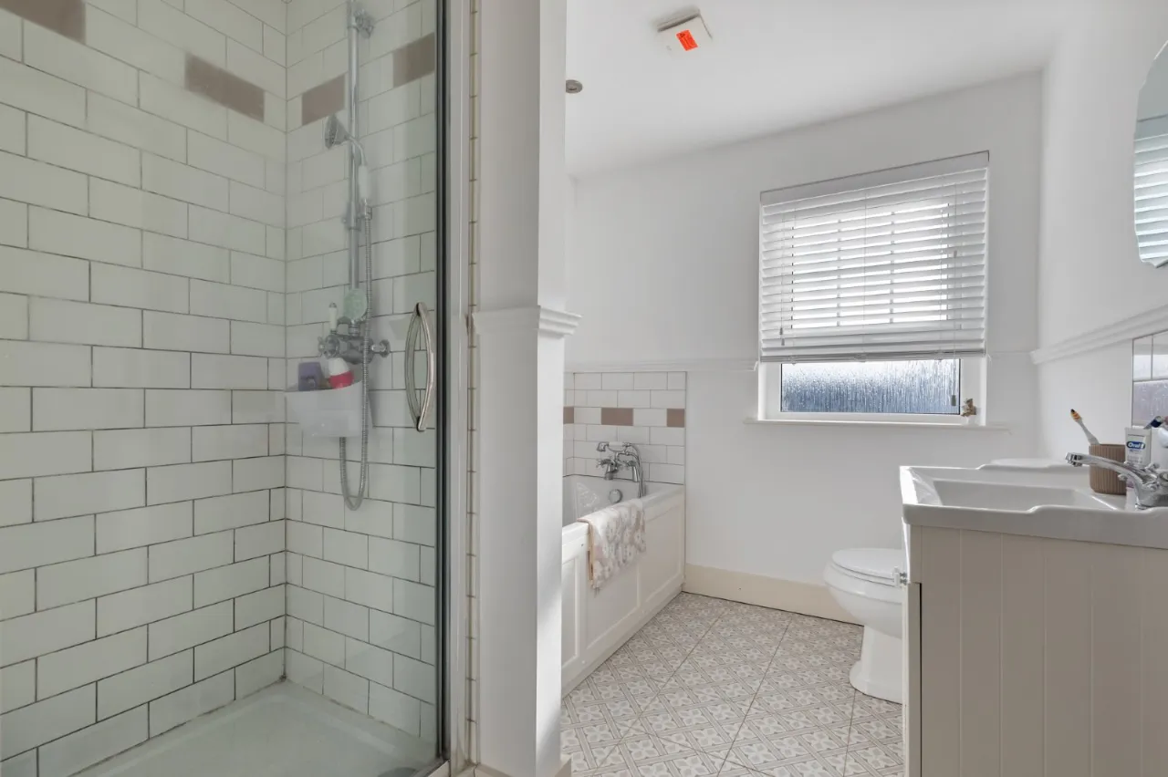 Traditional style white suite comprising: panelled bath with mixer taps and telephone hand shower over bath, separate fully tiled shower cubicle with thermostatically controlled shower, rain head and telephone hand shower, vanity sink unit with mixer taps, low flush WC, chrome towel radiator, wall tiling, period style ceramic tiled floor, LED recessed spotlighting, extractor fan.