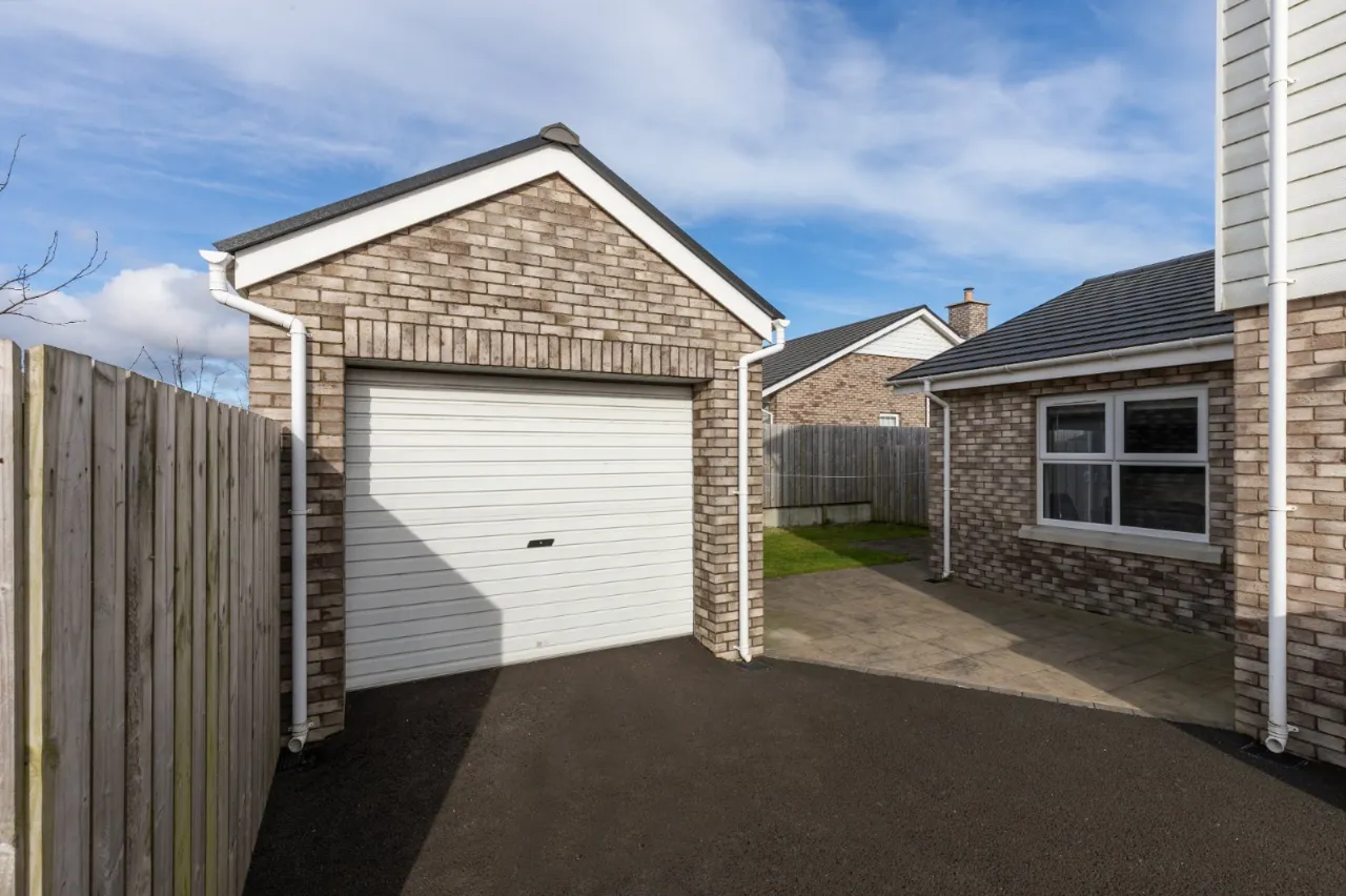 White electronically operated roller door, light and power, uPVC double glazed side window, timber side pedestrian door, approached via extensive tarmac driveway with off road parking for four cars.