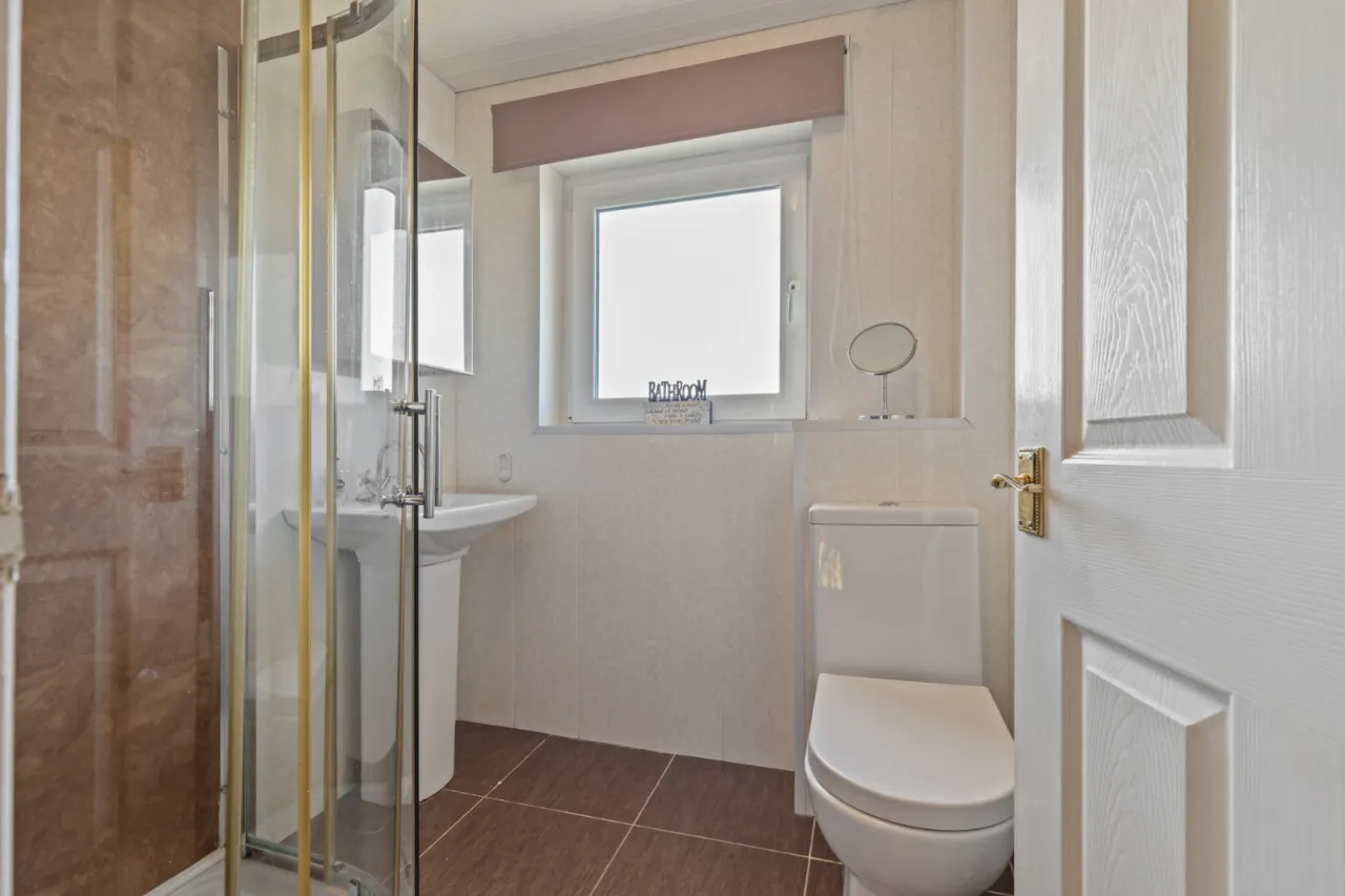 Modern white suite, seperate shower cubilcle. Redring thermostatically controlled shower, pedestal wash hand basin with mixer taps, push button WC, chrome towel radiator and extractor fan.